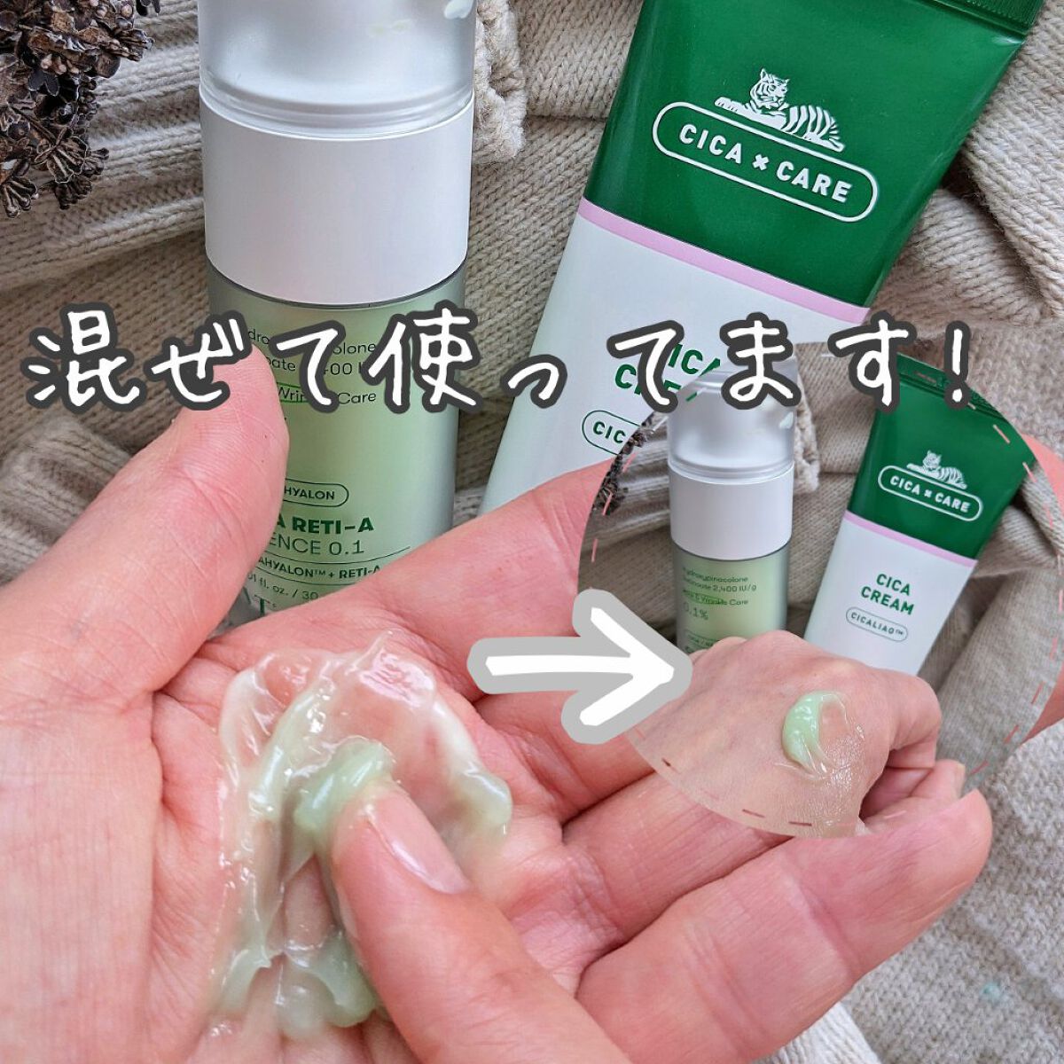 CICAレチAエッセンスはレチノール初心者さんにも始めやすい低刺激タイプ。 VT CICAレチAエッセンスをつけていきます。とても軽くてサラッとした使い心地。 CICAクリームは油分・水分バランスを整えて肌バリア機能をサポートしてくれるそう。