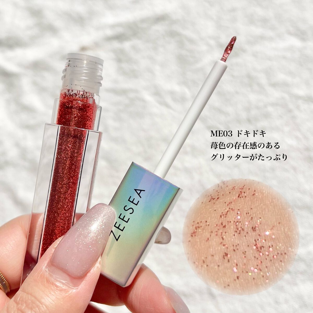 ロムアンドは細かいラメがたっぷりタイプ。 ゴールドとピンクのラメ。1番ラメが細かくて上品なので大人でも◎ ラメのサイズが小さい分落ちたのもわかりずらくて良い。 ZEESEAは液もピンク色なので存在感あり。 ラメはピンク、パープル、オレンジ、グリーンに見えます。1番華やか! カラフルにしたいならZEESEA✨ 耐久性は、アンリシアがNo.1👑 私は普段使いならロムアンド、イベント使いはアンリシアがいいなって思いました!