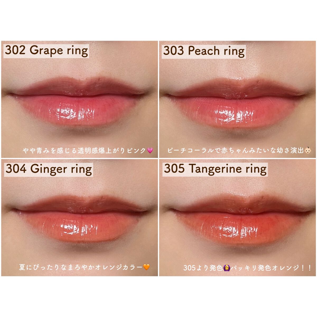 - <301 フィグリング> ジフェニルジメチコン、水、リンゴ酸ジイソステアリル、ビスジグリセリルポリアシルアジペート-2、オクチルドデカノール、水添ポリイソブテン、ダイマージリノール酸ダイマージリノレイルビス(ベヘニル/イ ソステアリル/フィトステリル)、セチルPEG/PPG-10/1ジメチコン、グリセリン、BG、イソステア リン酸ソルビタン(小麦由来)、ポリソルベート60(小麦由来)、ペンチレングリコール、(アクリル酸ヒドロキシエチル/アクリロイルジメチルタウ リンNa)コポリマー、セテアレス- 20、スクワラン、フェノキシエタノール、ステビオシド、香料、エチルヘキシルグリセリン、水酸化Al、ポリアクリル酸アンモニウム、[+/-]酸化チ タン、黄4、赤227、黄5、青1 <302 ぶどうリング> ジフェニルジメチコン、水、リンゴ酸ジイソステアリル、ビスジグリセリルポリアシルアジペート-2、オクチルドデカノール、水添ポリイソブテン、ダイマージリノール酸ダイマージリノレイルビス(ベヘニル/イ ソステアリル/フィトステリル)、セチルPEG/PPG-10/1ジメチコン、グリセリン、BG、イソステア リン酸ソルビタン(小麦由来)、ポリソルベート60(小麦由来)、ペンチレングリコール、(アクリル酸ヒドロキシエチル/アクリロイルジメチルタウ リンNa)コポリマー、セテアレス- 20、スクワラン、フェノキシエタノール、ステビオシド、香料、エチルヘキシルグリセリン、水酸化Al、ポリアクリル酸アンモニウム、[+/-]酸化チ タン、黄4、赤227、黄5、青1 <303 ももリング> ジフェニルジメチコン、水、リンゴ酸ジイソステアリル、ビスジグリセリルポリアシルアジペート-2、オクチルドデカノール、水添ポリイソブテン、ダイマージリノール酸ダイマージリノレイルビス(ベヘニル/イ ソステアリル/フィトステリル)、セチルPEG/PPG-10/1ジメチコン、グリセリン、BG、イソステア リン酸ソルビタン(小麦由来)、ポリソルベート60(小麦由来)、ペンチレングリコール、(アクリル酸ヒドロキシエチル/アクリロイルジメチルタウ リンNa)コポリマー、セテアレス- 20、スクワラン、フェノキシエタノール、ステビオシド、香料、エチルヘキシルグリセリン、水酸化Al、ポリアクリル酸アンモニウム、[+/-]酸化チ タン、黄4、赤227、黄5、青1 <304 ジンジャーリング> ジフェニルジメチコン、水、リンゴ酸ジイソステアリル、ビスジグリセリルポリアシルアジペート-2、オクチルドデカノール、水添ポリイソブテン、ダイマージリノール酸ダイマージリノレイルビス(ベヘニル/イ ソステアリル/フィトステリル)、セチルPEG/PPG-10/1ジメチコン、グリセリン、BG、イソステア リン酸ソルビタン(小麦由来)、ポリソルベート60(小麦由来)、ペンチレングリコール、(アクリル酸ヒドロキシエチル/アクリロイルジメチルタウ リンNa)コポリマー、セテアレス- 20、スクワラン、フェノキシエタノール、ステビオシド、香料、エチルヘキシルグリセリン、水酸化Al、ポリアクリル酸アンモニウム、[+/-]酸化チ タン、黄4、赤227、黄5、青1 <305 みかんリング> ジフェニルジメチコン、水、リンゴ酸ジイソステアリル、ビスジグリセリルポリアシルアジペート-2、オクチルドデカノール、水添ポリイソブテン、ダイマージリノール酸ダイマージリノレイルビス(ベヘニル/イ ソステアリル/フィトステリル)、セチルPEG/PPG-10/1ジメチコン、グリセリン、BG、イソステア リン酸ソルビタン(小麦由来)、ポリソルベート60(小麦由来)、ペンチレングリコール、(アクリル酸ヒドロキシエチル/アクリロイルジメチルタウ リンNa)コポリマー、セテアレス- 20、スクワラン、フェノキシエタノール、ステビオシド、香料、エチルヘキシルグリセリン、水酸化Al、ポリアクリル酸アンモニウム、[+/-]酸化チ タン、黄4、赤227、黄5、青1 <306 エンジェルリング> ジフェニルジメチコン、水、リンゴ酸ジイソステアリル、ビスジグリセリルポリアシルアジペート-2、オクチルドデカノール、水添ポリイソブテン、ダイマージリノール酸ダイマージリノレイルビス(ベヘニル/イ ソステアリル/フィトステリル)、セチルPEG/PPG-10/1ジメチコン、グリセリン、BG、イソステア リン酸ソルビタン(小麦由来)、ポリソルベート60(小麦由来)、ペンチレングリコール、(アクリル酸ヒドロキシエチル/アクリロイルジメチルタウ リンNa)コポリマー、セテアレス- 20、スクワラン、フェノキシエタノール、ステビオシド、香料、エチルヘキシルグリセリン、水酸化Al、ポリアクリル酸アンモニウム、[+/-]酸化チ タン、黄4、赤227、黄5、青1 <307 ココリング> ジフェニルジメチコン、水、リンゴ酸ジイソステアリル、ビスジグリセリルポリアシルアジペート-2、オクチルドデカノール、水添ポリイソブテン、ダイマージリノール酸ダイマージリノレイルビス(ベヘニル/イソステアリル/フィトステリル)、グリセリン、セチルPEG/PPG-10/1ジメチコン、BG、イソステアリン酸ソルビタン(小麦由来)、ポリソルベート60(小麦由来)、ペンチレングリコール、(アクリル酸ヒドロキシエチル/アク