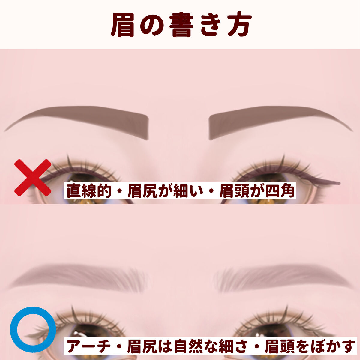 ・涙袋の影の部分まで、ベースを塗ることで縦幅がかなり強調されて丸目にみえる! ・アイシャドウの陰影とラメのハイライト効果で奥まった目に光を取り込んで出目っぽくみせる! ・淡いピンクのアイシャドウ、艶のようなラメ、細くて短いブラックアイラインが特徴 ・つり目を自然にいかせて、美人な雰囲気になれる! ・単色メイクは簡単そうに見えて難しいけど、ブラシを使うと綺麗なグラデーションになる! ・目の形によって中間色をどこまで入れるか変わるけど「目を開けた時に5mm見える」を基準にする