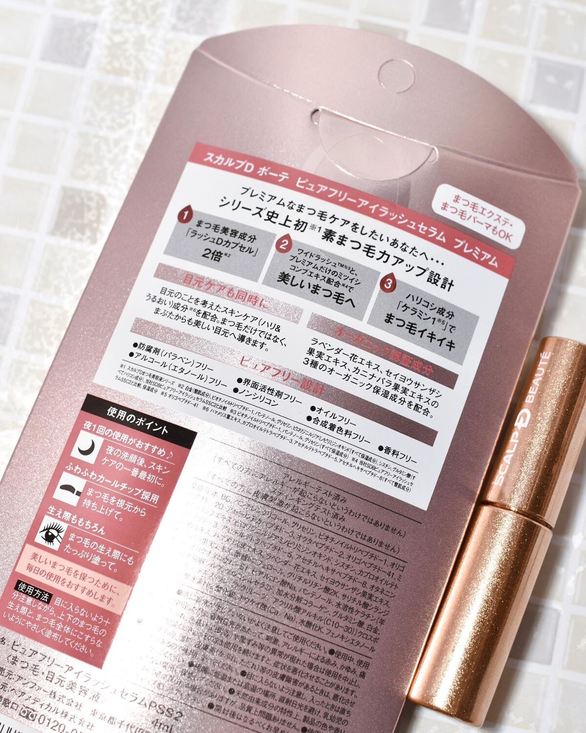 - スカルプDのまつ毛美容液プレミアムは、まつ毛ケア成分を通常品の2倍配合しており、1日1回のケアでもOK♪ さらに、プレミアムには、目元ケア成分配合。まつ毛のハリコシがアップし、上向きカールまつ毛をぐ~んとキープ♪ 使いやすさ・やさしさにこだわった、ふわふわカールチップ採用で根元からも塗りやすく、敏感な目元にやさしい使い心地です。 シリコン、オイル、アルコール(エタノール)、防腐剤(パラベン)、香料、合成着色料、界面活性剤、プロスタグランジン類似物質の8つの成分不使用の“ピュアフリー設計”を実現。 まつ毛エクステ、まつ毛パーマにもご使用いただけます。