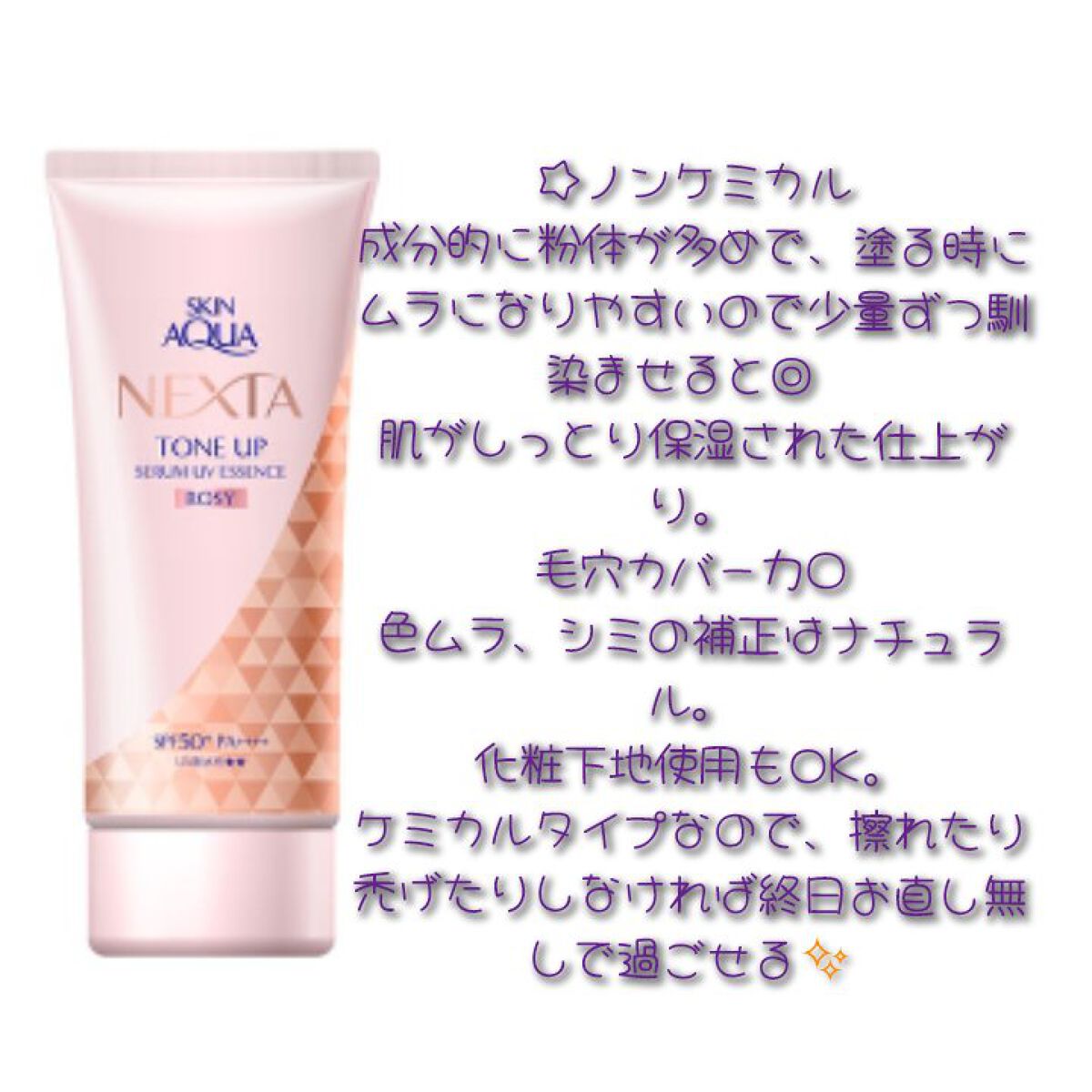 ニベア塗りやすくベタつきのなさが🙆🏻♀️💗ケミカル日焼け止めは2〰️3時間おきに塗り直し必須なので💦塗り直すために一旦全部OFFしないとそのまま重ねると白塗りになります🤣オフの手間が取れる人向き🙋♀️ あと、私は肌が荒れてる時にニベアを使用して紫外線浴びてたら痒みが出てしまいました🥹敏感肌さんはやはり気をつけて✋塗り心地最高なので、インドアの時かつ塗り直す余裕がある時に使用します。 スキンアクアネクスタしっとり保湿タイプなのでベタベタではないが、サラッとはしないw少量ずつ塗らないとムラになります💦ノンケミカルなので剥げない限りは基本的に塗り直しが不要👍🏻 ̖́私は、化粧下地として使い、ノンケミカルのファンデと粉で固定して使ってます。塗りなおす手間が逆に肌負担になるので、ズボラな私はノンケミカル派です(・᷄֊•̀ก"