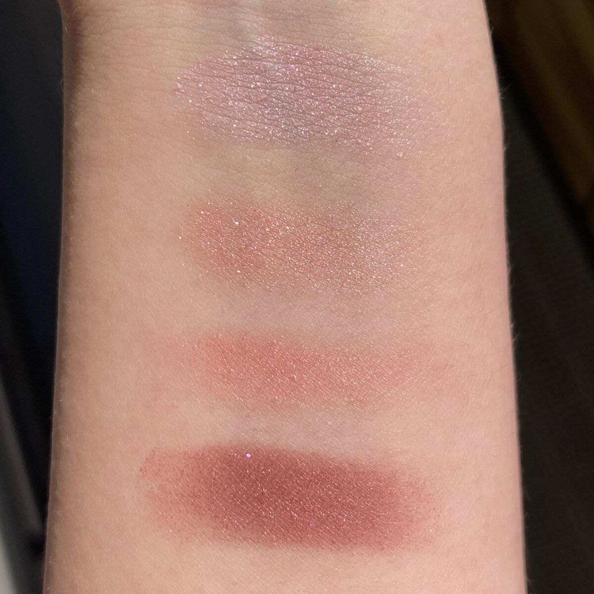 アイシャドウとハイライトがセットになった便利パレット! 2022年大人気だった限定カラーが復活して定番色に! どうみても誰もが使いやすいし好感度高い配色💗 暖かみのあるベージュトーンパレットでどう使ってもナチュラルで抜け感のあるメイクに✨ ラメは細かく繊細だから派手になりすぎず上品☺️ 他の3色はかなり似た色だから簡単にグラデーションが作れるよ! ハイライトはパール感があってツヤッツヤ✨ ベージュトーンのハイライトだから肌馴染みも抜群! 自然なツヤ感と立体感を作ってくれるよ😆