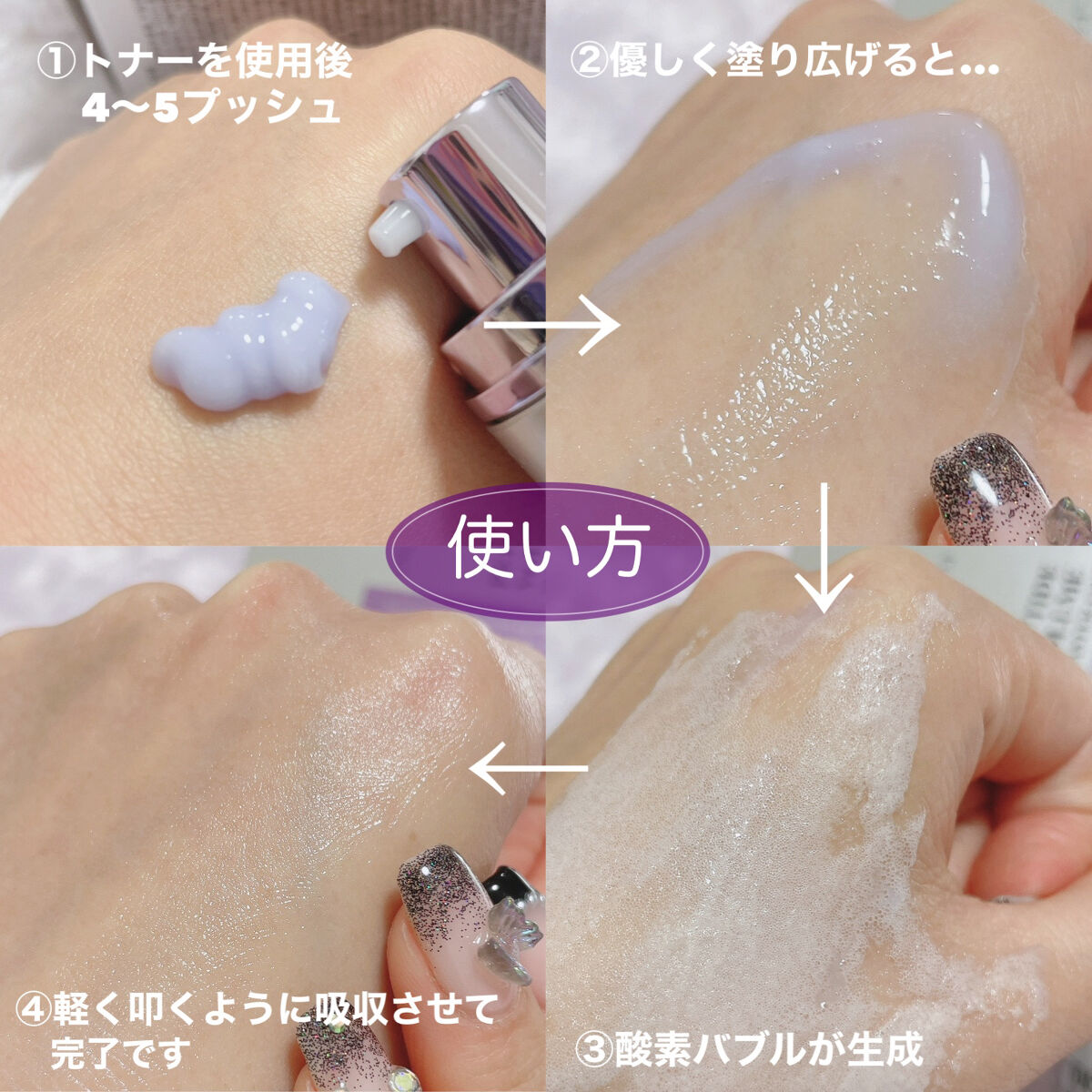| 柔らかい乳液のようなテクスチャーのエッセンスをお肌に塗ると、たちまちしゅわしゅわと泡が出る…!! | 詳細を見る | |||