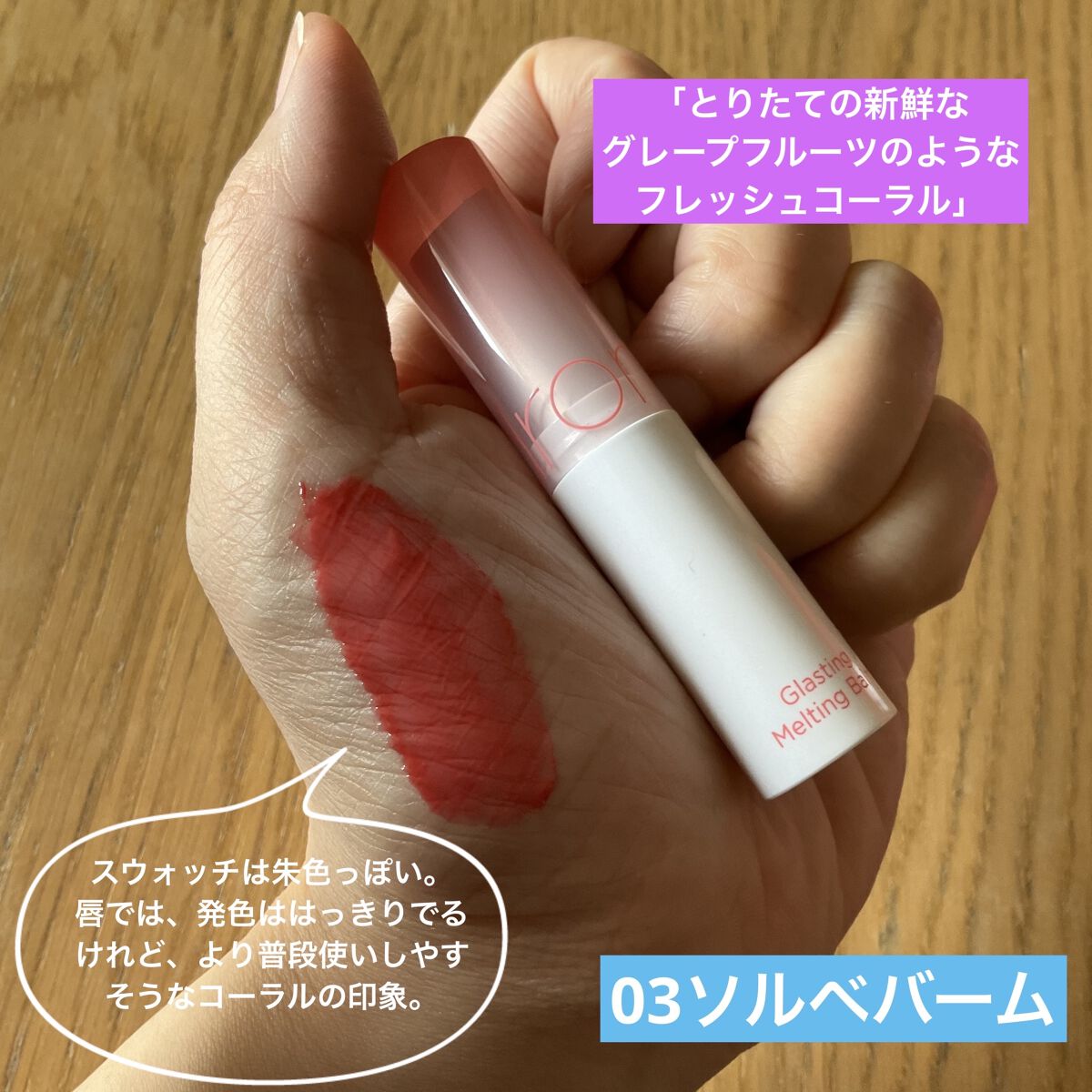 - もちっとした水膜で弾けそうなツヤリップ 1.軽い塗り心地のなめらかで透明な水爆弾ツヤ 2.塗った瞬間から唇を鮮やかに彩る多彩なカラーバーム 3.植物性保湿オイルでしっとりもっちり保湿バーム