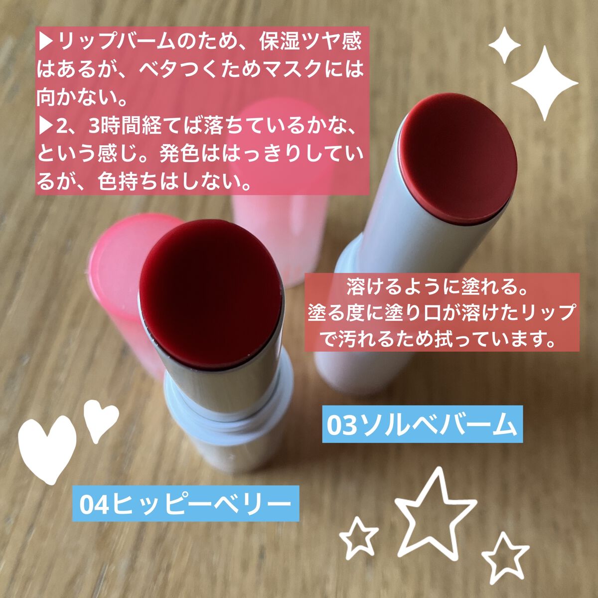 - <01 ココヌード(Coco Nude)> リンゴ酸ジイソステアリル、ダイマージリノール酸ダイマージリノレイルビス(ベヘニル/イソステアリル/フィトステリル)、トリイソステアリン酸ポリグリセリル-2、ビスジグリセリルポリアシルアジペート-2、パラフィン、トリメリト酸トリトリデシル、テトライソステアリン酸ペンタエリスリチル、マイクロクリスタリンワックス、イソステアリン酸ソルビタン、1,2-ヘキサンジオール、ジステアルジモニウムヘクトライト、合成ワックス、酸化チタン、(エチレン/プロピレン)コポリマー、酸化鉄、炭酸プロピレン、香料、赤104(1)、リモネン、リナロール、ホホバ種子油、アーモンド油、アンズ核油、月見草油、オリーブ果実油、アルガニアスピノサ核油、シア脂、ツバキ種子油、トリ(カプリル/カプリン酸)グリセリル、マンゴー果実エキス、カニナバラ果実エキス <02 ラヴィーピンク(Lovey Pink)> リンゴ酸ジイソステアリル、ダイマージリノール酸ダイマージリノレイルビス(ベヘニル/イソステアリル/フィトステリル)、トリイソステアリン酸ポリグリセリル-2、ビスジグリセリルポリアシルアジペート-2、パラフィン、トリメリト酸トリトリデシル、テトライソステアリン酸ペンタエリスリチル、マイクロクリスタリンワックス、イソステアリン酸ソルビタン、1,2-ヘキサンジオール、ジステアルジモニウムヘクトライト、合成ワックス、酸化チタン、(エチレン/プロピレン)コポリマー、赤104(1)、黄5、炭酸プロピレン、赤202、香料、リモネン、リナロール、ホホバ種子油、アーモンド油、アンズ核油、月見草油、オリーブ果実油、アルガニアスピノサ核油、シア脂、ツバキ種子油、トリ(カプリル/カプリン酸)グリセリル、マンゴー果実エキス、カニナバラ果実エキス <03 ソルベバーム(Sorbet Balm)> リンゴ酸ジイソステアリル、ダイマージリノール酸ダイマージリノレイルビス(ベヘニル/イソステアリル/フィトステリル)、トリイソステアリン酸ポリグリセリル-2、ビスジグリセリルポリアシルアジペート-2、パラフィン、トリメリト酸トリトリデシル、テトライソステアリン酸ペンタエリスリチル、マイクロクリスタリンワックス、イソステアリン酸ソルビタン、1,2-ヘキサンジオール、ジステアルジモニウムヘクトライト、合成ワックス、酸化チタン、赤104(1)、(エチレン/プロピレン)コポリマー、酸化鉄、黄5、炭酸プロピレン、香料、リモネン、リナロール、アルガニアスピノサ核油、シア脂、ツバキ種子油、トリ(カプリル/カプリン酸)グリセリル、アーモンド油、アンズ核油、月見草油、オリーブ果実油、ホホバ種子油、マンゴー果実エキス、カニナバラ果実エキス <04 ヒッピーベリー(Hippie Berry)> リンゴ酸ジイソステアリル、ダイマージリノール酸ダイマージリノレイルビス(ベヘニル/イソステアリル/フィトステリル)、トリイソステアリン酸ポリグリセリル-2、ビスジグリセリルポリアシルアジペート-2、パラフィン、トリメリト酸トリトリデシル、テトライソステアリン酸ペンタエリスリチル、マイクロクリスタリンワックス、イソステアリン酸ソルビタン、1,2-ヘキサンジオール、ジステアルジモニウムヘクトライト、合成ワックス、赤104(1)、黄5、(エチレン/プロピレン)コポリマー、赤202、炭酸プロピレン、酸化鉄、酸化チタン、香料、リモネン、リナロール、ホホバ種子油、アーモンド油、アンズ核油、月見草油、オリーブ果実油、アルガニアスピノサ核油、シア脂、ツバキ種子油、トリ(カプリル/カプリン酸)グリセリル、カニナバラ果実エキス、マンゴー果実エキス <05 ヌガーサンド(Nougat Sand)> リンゴ酸ジイソステアリル、ダイマージリノール酸ダイマージリノレイルビス(ベヘニル/イソステアリル/フィトステリル)、トリイソステアリン酸ポリグリセリル-2、ビスジグリセリルポリアシルアジペート-2、パラフィン、トリメリト酸トリトリデシル、テトライソステアリン酸ペンタエリスリチル、マイクロクリスタリンワックス、イソステアリン酸ソルビタン、酸化チタン、1,2-ヘキサンジオール、ジステアルジモニウムヘクトライト、合成ワックス、黄4、(エチレン/プロピレン)コポリマー、酸化鉄、炭酸プロピレン、赤202、香料、リモネン、青1、リナロール、シア脂、ツバキ種子油、トリ(カプリル/カプリン酸)グリセリル、アルガニアスピノサ核油、ホホバ種子油、アーモンド油、アンズ核油、月見草油、オリーブ果実油、マンゴー果実エキス、カニナバラ果実エキス <06 カヤフィグ(Kaya Fig)> リンゴ酸ジイソステアリル、ダイマージリノール酸ダイマージリノレイルビス(ベヘニル/イソステアリル/フィトステリル)、トリイソステアリン酸ポリグリセリル-2、ビスジグリセリルポリアシルアジペート-2、パラフィン、トリメリト酸トリトリデシル、テトライソステアリン酸ペンタエリスリチル、マイクロクリスタリンワックス、イソステアリン酸ソルビタン、1,2-ヘキサンジオール、酸化チタン、ジステアルジモニウムヘク