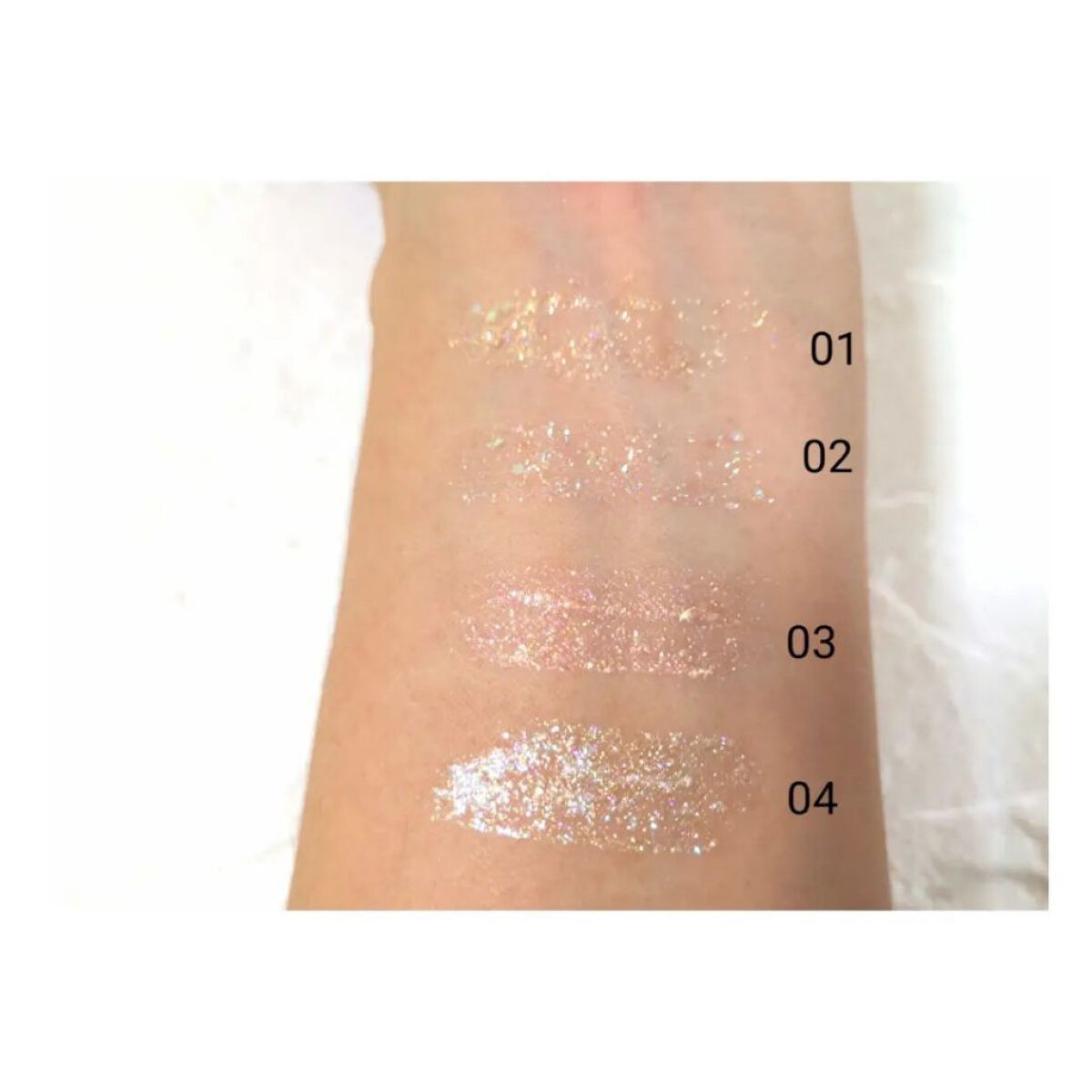 リキッドタイプのグリッターラメなんだけど、これめちゃくちゃ綺麗〜〜〜!😳🫶🏻 ラメが大きめで少し塗るだけでかなりの存在感! 04はこのシリーズの中だと少し小さめのラメなのでさらに韓国アイドルっぽい目元になりたい人は01~03番がおすすめ🫶🏻