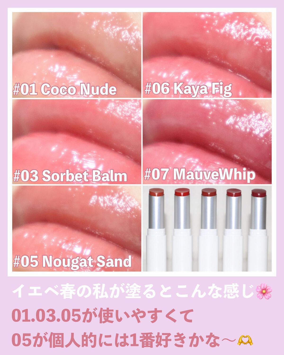 - <01 ココヌード(Coco Nude)> リンゴ酸ジイソステアリル、ダイマージリノール酸ダイマージリノレイルビス(ベヘニル/イソステアリル/フィトステリル)、トリイソステアリン酸ポリグリセリル-2、ビスジグリセリルポリアシルアジペート-2、パラフィン、トリメリト酸トリトリデシル、テトライソステアリン酸ペンタエリスリチル、マイクロクリスタリンワックス、イソステアリン酸ソルビタン、1,2-ヘキサンジオール、ジステアルジモニウムヘクトライト、合成ワックス、酸化チタン、(エチレン/プロピレン)コポリマー、酸化鉄、炭酸プロピレン、香料、赤104(1)、リモネン、リナロール、ホホバ種子油、アーモンド油、アンズ核油、月見草油、オリーブ果実油、アルガニアスピノサ核油、シア脂、ツバキ種子油、トリ(カプリル/カプリン酸)グリセリル、マンゴー果実エキス、カニナバラ果実エキス <02 ラヴィーピンク(Lovey Pink)> リンゴ酸ジイソステアリル、ダイマージリノール酸ダイマージリノレイルビス(ベヘニル/イソステアリル/フィトステリル)、トリイソステアリン酸ポリグリセリル-2、ビスジグリセリルポリアシルアジペート-2、パラフィン、トリメリト酸トリトリデシル、テトライソステアリン酸ペンタエリスリチル、マイクロクリスタリンワックス、イソステアリン酸ソルビタン、1,2-ヘキサンジオール、ジステアルジモニウムヘクトライト、合成ワックス、酸化チタン、(エチレン/プロピレン)コポリマー、赤104(1)、黄5、炭酸プロピレン、赤202、香料、リモネン、リナロール、ホホバ種子油、アーモンド油、アンズ核油、月見草油、オリーブ果実油、アルガニアスピノサ核油、シア脂、ツバキ種子油、トリ(カプリル/カプリン酸)グリセリル、マンゴー果実エキス、カニナバラ果実エキス <03 ソルベバーム(Sorbet Balm)> リンゴ酸ジイソステアリル、ダイマージリノール酸ダイマージリノレイルビス(ベヘニル/イソステアリル/フィトステリル)、トリイソステアリン酸ポリグリセリル-2、ビスジグリセリルポリアシルアジペート-2、パラフィン、トリメリト酸トリトリデシル、テトライソステアリン酸ペンタエリスリチル、マイクロクリスタリンワックス、イソステアリン酸ソルビタン、1,2-ヘキサンジオール、ジステアルジモニウムヘクトライト、合成ワックス、酸化チタン、赤104(1)、(エチレン/プロピレン)コポリマー、酸化鉄、黄5、炭酸プロピレン、香料、リモネン、リナロール、アルガニアスピノサ核油、シア脂、ツバキ種子油、トリ(カプリル/カプリン酸)グリセリル、アーモンド油、アンズ核油、月見草油、オリーブ果実油、ホホバ種子油、マンゴー果実エキス、カニナバラ果実エキス <04 ヒッピーベリー(Hippie Berry)> リンゴ酸ジイソステアリル、ダイマージリノール酸ダイマージリノレイルビス(ベヘニル/イソステアリル/フィトステリル)、トリイソステアリン酸ポリグリセリル-2、ビスジグリセリルポリアシルアジペート-2、パラフィン、トリメリト酸トリトリデシル、テトライソステアリン酸ペンタエリスリチル、マイクロクリスタリンワックス、イソステアリン酸ソルビタン、1,2-ヘキサンジオール、ジステアルジモニウムヘクトライト、合成ワックス、赤104(1)、黄5、(エチレン/プロピレン)コポリマー、赤202、炭酸プロピレン、酸化鉄、酸化チタン、香料、リモネン、リナロール、ホホバ種子油、アーモンド油、アンズ核油、月見草油、オリーブ果実油、アルガニアスピノサ核油、シア脂、ツバキ種子油、トリ(カプリル/カプリン酸)グリセリル、カニナバラ果実エキス、マンゴー果実エキス <05 ヌガーサンド(Nougat Sand)> リンゴ酸ジイソステアリル、ダイマージリノール酸ダイマージリノレイルビス(ベヘニル/イソステアリル/フィトステリル)、トリイソステアリン酸ポリグリセリル-2、ビスジグリセリルポリアシルアジペート-2、パラフィン、トリメリト酸トリトリデシル、テトライソステアリン酸ペンタエリスリチル、マイクロクリスタリンワックス、イソステアリン酸ソルビタン、酸化チタン、1,2-ヘキサンジオール、ジステアルジモニウムヘクトライト、合成ワックス、黄4、(エチレン/プロピレン)コポリマー、酸化鉄、炭酸プロピレン、赤202、香料、リモネン、青1、リナロール、シア脂、ツバキ種子油、トリ(カプリル/カプリン酸)グリセリル、アルガニアスピノサ核油、ホホバ種子油、アーモンド油、アンズ核油、月見草油、オリーブ果実油、マンゴー果実エキス、カニナバラ果実エキス <06 カヤフィグ(Kaya Fig)> リンゴ酸ジイソステアリル、ダイマージリノール酸ダイマージリノレイルビス(ベヘニル/イソステアリル/フィトステリル)、トリイソステアリン酸ポリグリセリル-2、ビスジグリセリルポリアシルアジペート-2、パラフィン、トリメリト酸トリトリデシル、テトライソステアリン酸ペンタエリスリチル、マイクロクリスタリンワックス、イソステアリン酸ソルビタン、1,2-ヘキサンジオール、酸化チタン、ジステアルジモニウムヘク