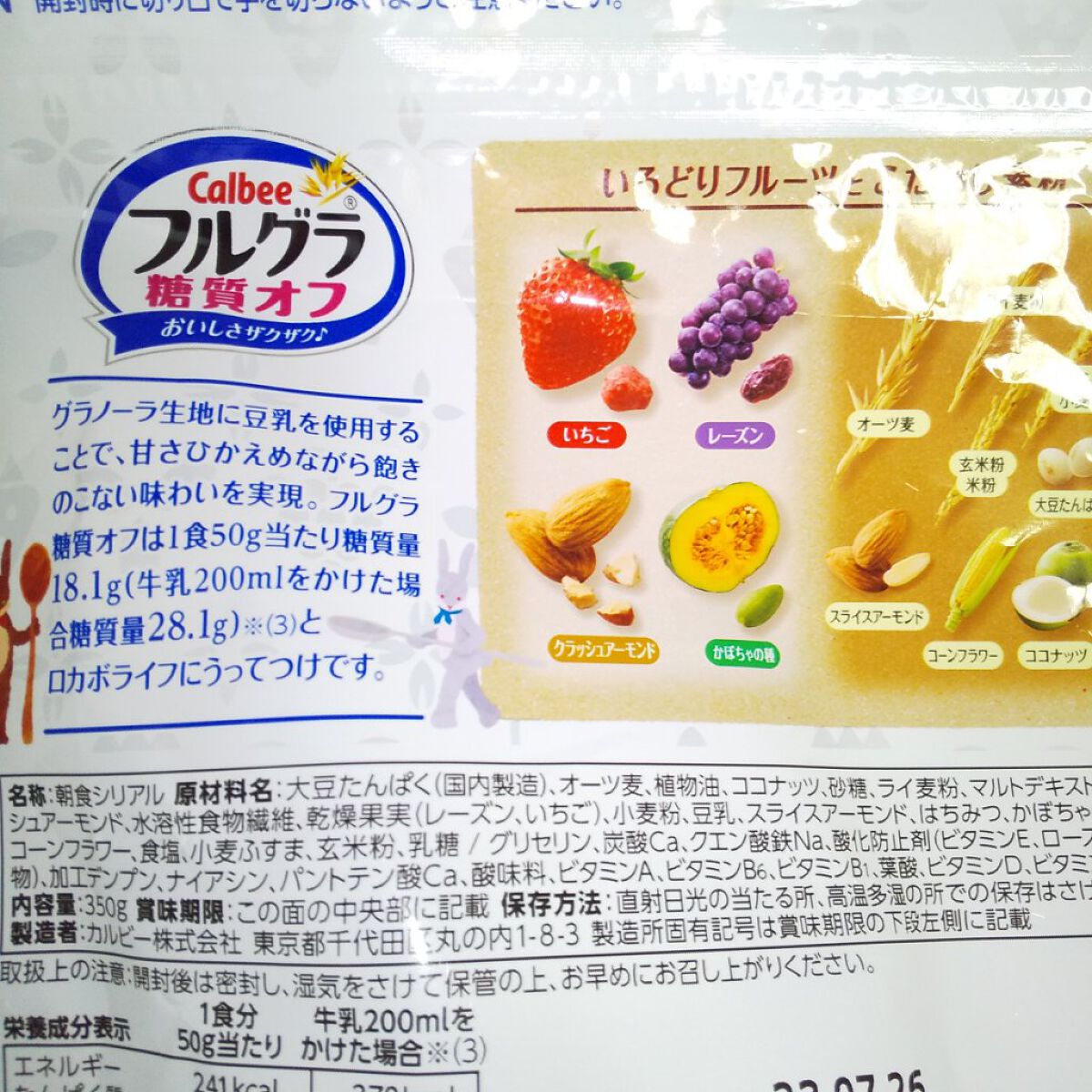 - リニューアル発売 グラノーラ生地に豆乳を使用することで、甘さひかえめながら飽きのこない味わいを実現させた商品です。 糖質25%オフ(※)は、1食(50g)当たりの糖質量が18.9g(牛乳200mlをかけた場合糖質量28.9g)なので、ロカボライフにうってつけです。 糖質摂取が気になる方や既存品では甘さが気になるグラノーラユーザーをターゲットに発売します。 ※:当社フルグラ比較 2023年8月下旬より順次自然切り替え