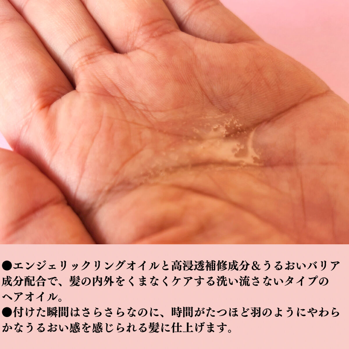 - エンジェリックリングオイル※1と毛髪補修成分※2&うるおいバリア成分※3を配合し、髪の内部まで浸透。 付けた瞬間はさらさらなのに、時間がたつほど羽のようにやわらかなうるおい感のある髪に仕上げます。 (カラーケア/ヒートプロテクト/湿気バリア) ※1 デカイソステアリン酸ポリグリセリル-10(ツヤ) ※2 オリーブ脂肪酸エチル ※3 キューティクルボンドオイル(ヤシ油) (毛髪コート)