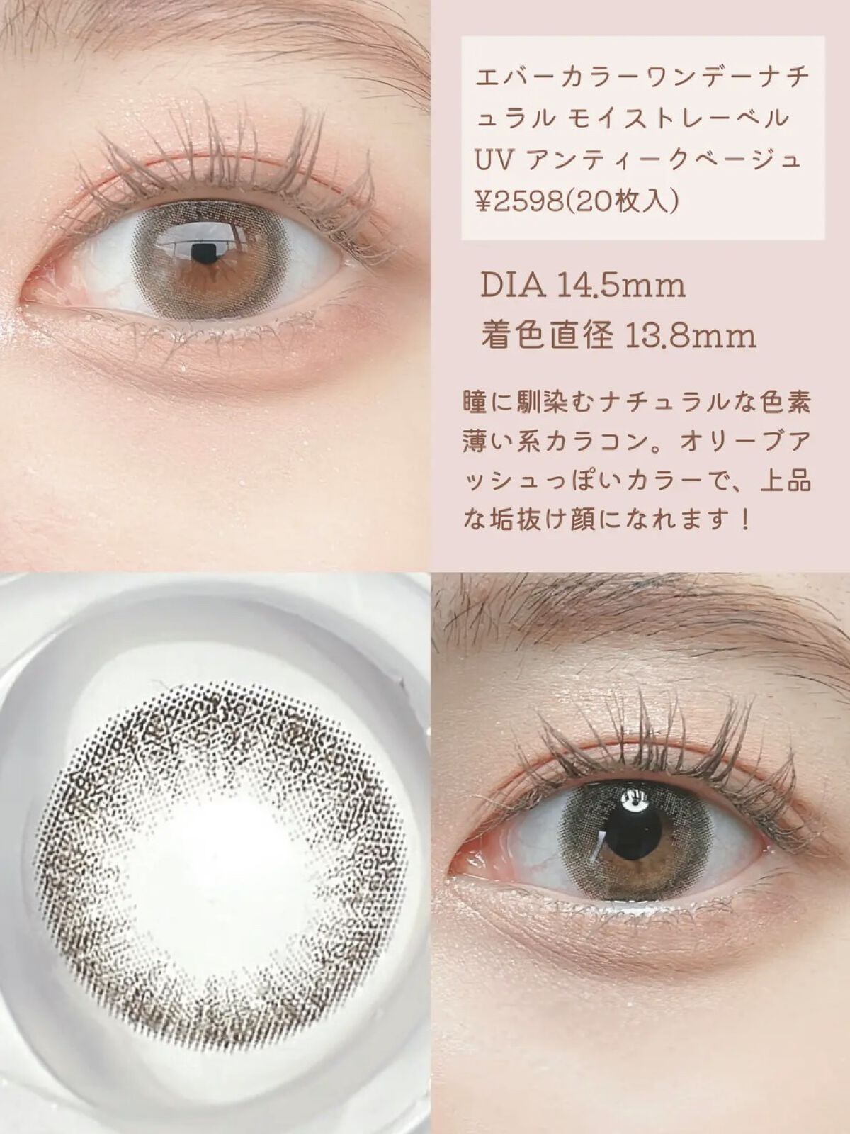 奥目解消発色×ぷるん系細フチ ♡大きめ エバーカラーワンデーナチュラル #ローズミューズ DIA14.5mm/着色直径13.8mm ナチュ盛り発色×ちゅるん系細フチ ♡小さめ エバーカラーワンデーミリモア #おねだりパール DIA14.2mm/着色直径13.1mm おしゃグレー発色×きゅるん系細フチ ♡大きめ エバーカラーワンデーナチュラル #パールスノーグレー DIA14.5mm/着色直径13.8mm
