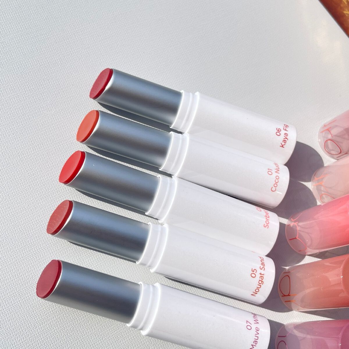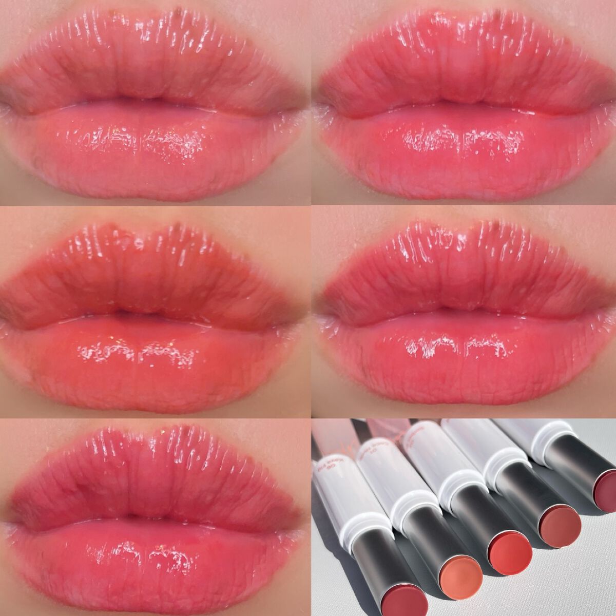 - もちっとした水膜で弾けそうなツヤリップ 1.軽い塗り心地のなめらかで透明な水爆弾ツヤ 2.塗った瞬間から唇を鮮やかに彩る多彩なカラーバーム 3.植物性保湿オイルでしっとりもっちり保湿バーム