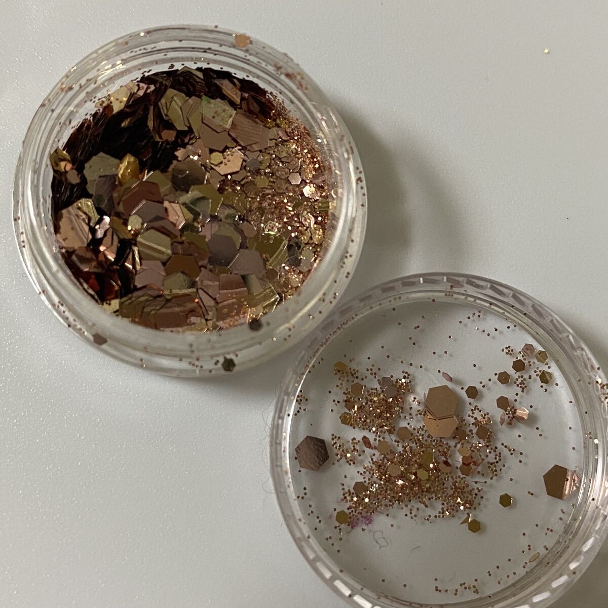 セリアのスモーキーピンクの上にローズピンクを重ね塗りすると春にぴったり淡く可愛いピンク色になりました🌸 グリッターもいろんな種類の色があり、細かいグリッターやミラー系と6種類も入っててたまたまこのブラウンとピンクが混ざった様なグリッターを見つけ購入しました✨ クリアにグリッターを乗せて塗り終わったら最後にトップで仕上げると、ピンク部分はちゅるんと綺麗になりグリッターは光でキラキラに✨ 普段乾燥してくすんでの私の手も白く見えて黄色みが強い肌を抑えてくれるような感じです💅