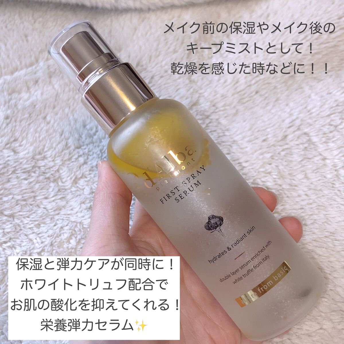 大好きすぎてリピりまくってます、噂のCAミスト。⸜d'Albaホワイトトリュフバイタルスプレーセラム⸝⋆︎* イタリア産ホワイトトリュフと植物性オイルで豊かな水分を与え、ツヤ肌に仕上げてくれる保湿ケアミスト! 高級感のあるパケに、保湿オイルとセラムが2層になっていて見た目も本当に可愛い✨