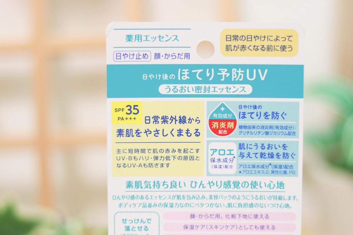 - 【医薬部外品】 ひんやり感のあるジェルが、のびよく全身に広がって、うるおいが角層まで浸透します。 ●日常紫外線から素肌をやさしくまもる SPF35/PA+++ 主に短時間で肌の赤みを引き起こす UV-B も、ハリ・弾力低下の原因となる UV-A も防ぎます。 ●日やけ後のほてりを防ぐ 植物由来の消炎剤(有効成分):グリチルリチン酸ジカリウム配合 ●肌にうるおいを与えて乾燥を防ぐ アロエ保水成分*1(保湿)配合 ●素肌気持ちよい ひんやり感覚の使い心地 ●ボディケア品のようにうるおうのにベタつきにくい、肌に負担感の少ないつけ心地 ○顔・からだ用。 ○化粧下地としても使えます。 ○保湿ケア(スキンケア)としても使えます。 ○せっけんで落とせます。(本品はウォータープルーフタイプではありません) ○鉱物油フリー・合成着色剤フリー 〇気分やすらぐフローラルハーブの香り ○アレルギーテスト済み(すべての方にアレルギーが起こらないというわけではありません) *1 アロエエキス‐2、異性化糖、PG