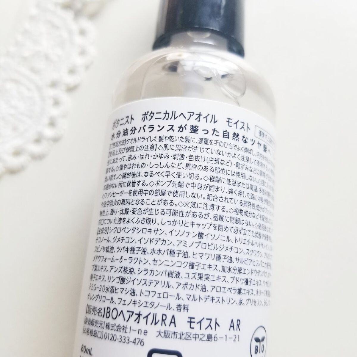- <ボタニカルヘアオイル(モイスト)> シクロペンタシロキサン、イソノナン酸イソノニル、トリエチルヘキサノイン、ジメチコノール、ジメチコン、イソドデカン、アミノプロピルジメチコン、スクワラン、アルガニアスピノサ核油、ツバキ種子油、ホホバ種子油、ヒマワリ種子油、サルビアヒスパニカ種子油、メドウフォームーδーラクトン、センニンコク種子エキス、加水分解エンドウタンパク、オリーブ葉エキス、アンズ核油、シラカンバ樹液、ユズ果実エキス、ブドウ種子エキス、ワサビノキ種子エキス、リンゴ酸ジイソステアリル、アボカド油、アロエベラ葉エキス、オリーブ果実油、PEG-20水添ヒマシ油、トコフェロール、マルトデキストリン、水、グリセリン、BG、ペンチレングリコール、フェノキシエタノール、香料