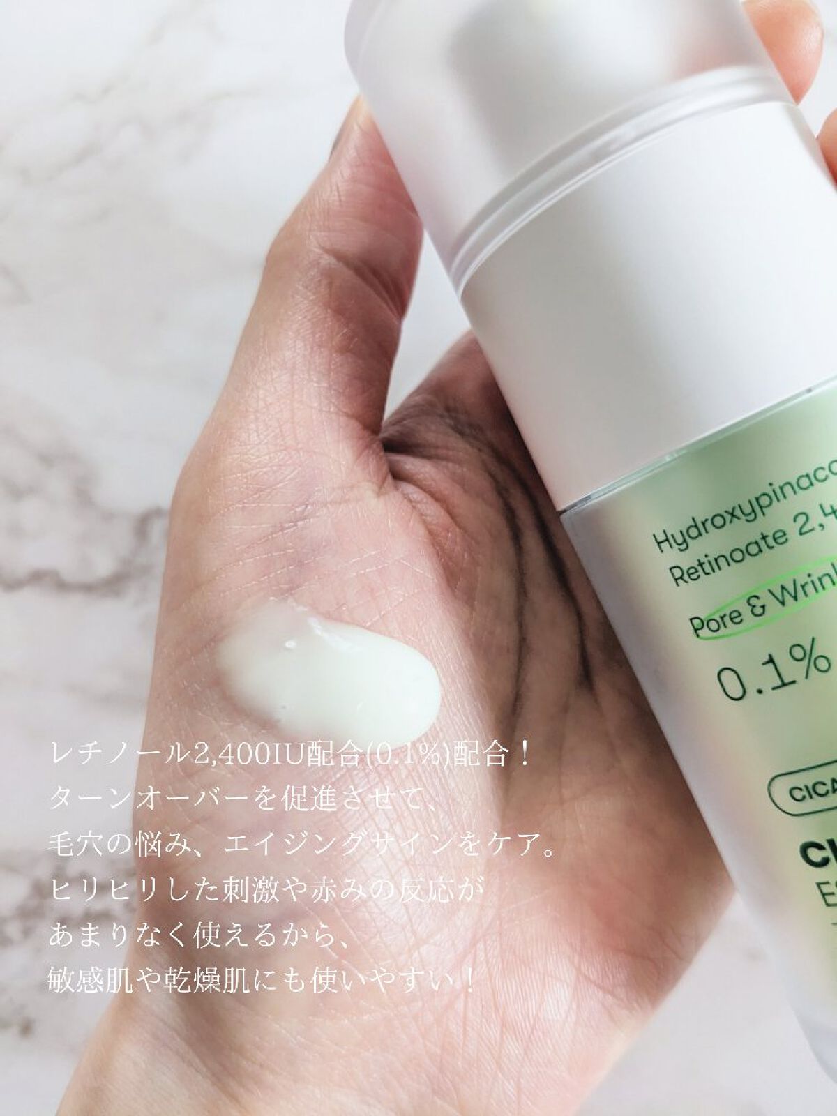 毛穴の開きや肌のハリ、シワが気になってついにレチノールを始めました。副反応が怖いので、配合率の少なく、炎症を落ち着けてくれるシカも入っているこちらを選びました💁🏻♀️先端が細くなっていて、少量ずつ出せるので量の調節がしやすい!初めはナイトク...