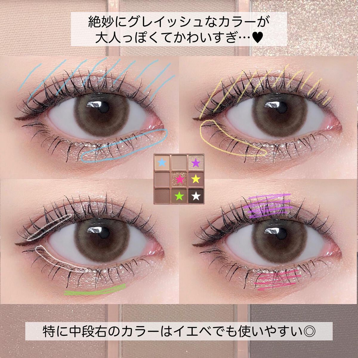 セミスモーキーメイクが楽しめるくすみカラーパレット🥀 ベースからグリッターまでそろった9色パレットで、どんな肌トーンにも合う適度な彩度で目元にソフトな陰影感を与えてくれます✨ マット・シマー・グリッターの質感が入っていて、しっとり柔らかい粉質になっています くすみカラーが揃っていて大人っぽいメイクができます🍂 クールなセミスモーキーメイクを楽しめるパレット、ぜひチェックしてみてください🤍