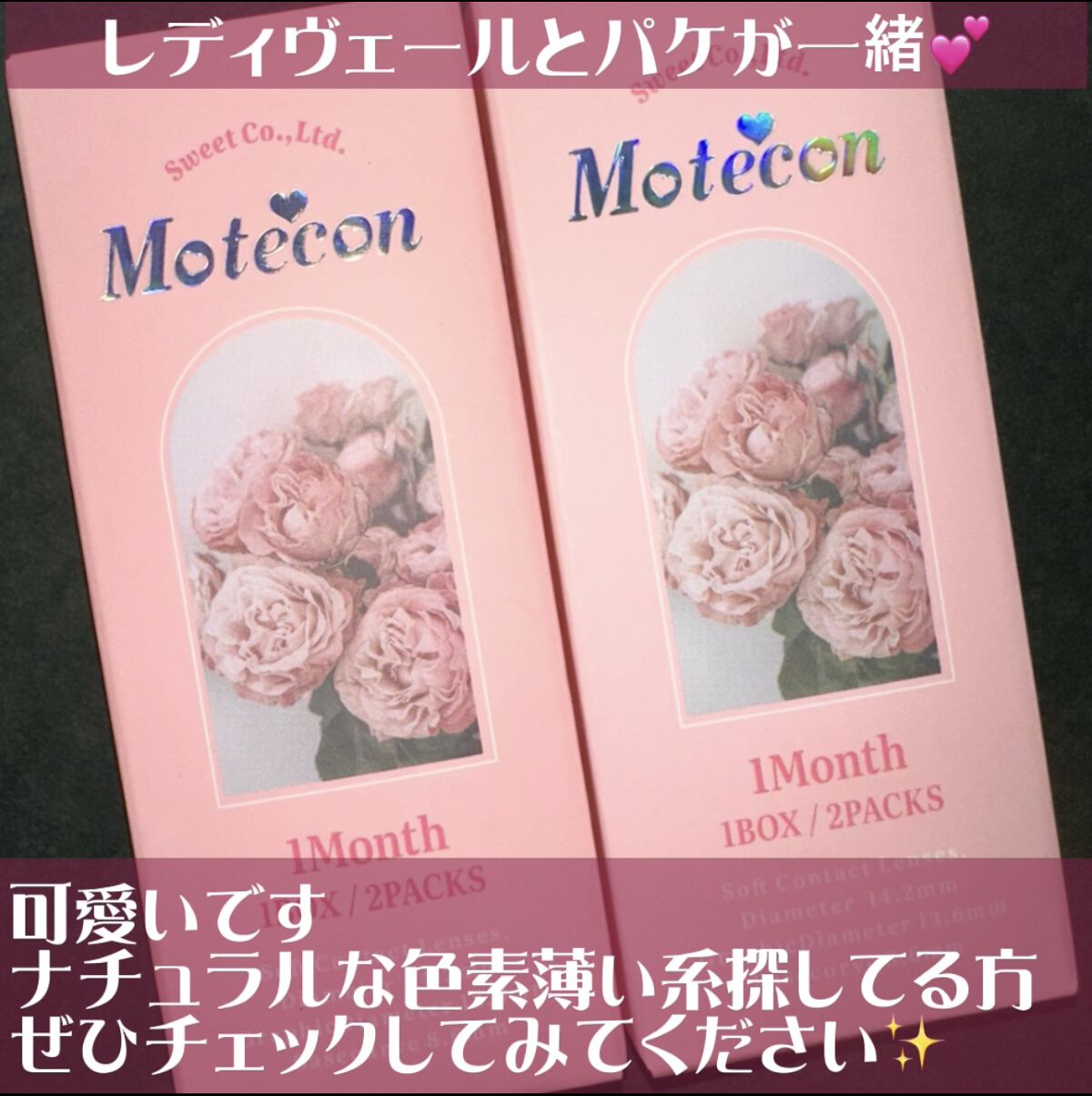 モテコンはなんど10年以上続くカラコンブランド! レディパール色素薄い系サークルで、ちゅるんとし潤んだ瞳に! レディヴェール優し気なダークブラウンカラーのカラコン!印象的なヴェールのようなデザインでふんわりした瞳になれます✨✨ どちらもピンクとお花の可愛いパッケージ! モテコンのマンスリーは1箱2枚入りでコスパも高めでした( •̤ᴗ•̤ )♡