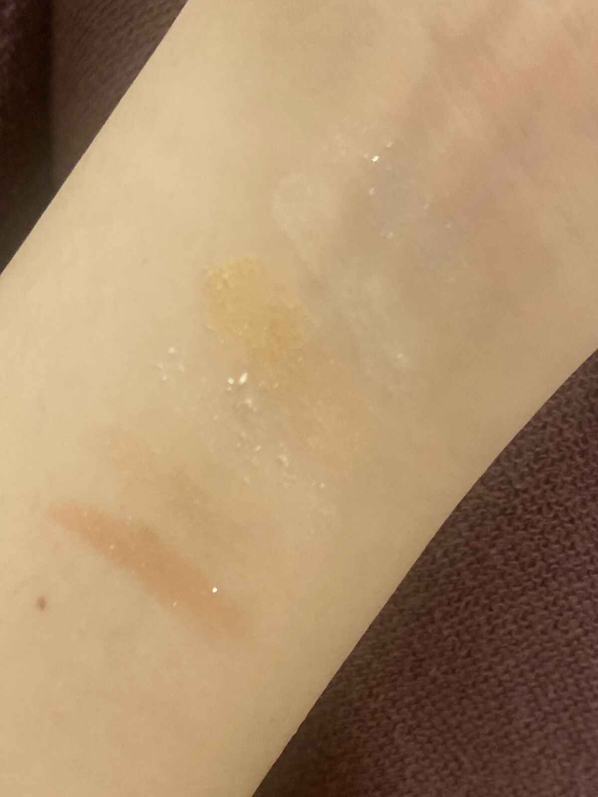 真ん中はラメありませんが、両端はとっても綺麗なラメで キラキラさせたい人オススメです! 青を鎖骨に塗ることでシュッと細く見えます! オフショルダーとか着る人おすすめします✨ 耳たぶにピンクと真ん中の明るいのを塗りましたが、血色ある耳たぶが出来ました! 耳って意外とみられるので、ちょっと耳にたすだけで雰囲気変わりました!
