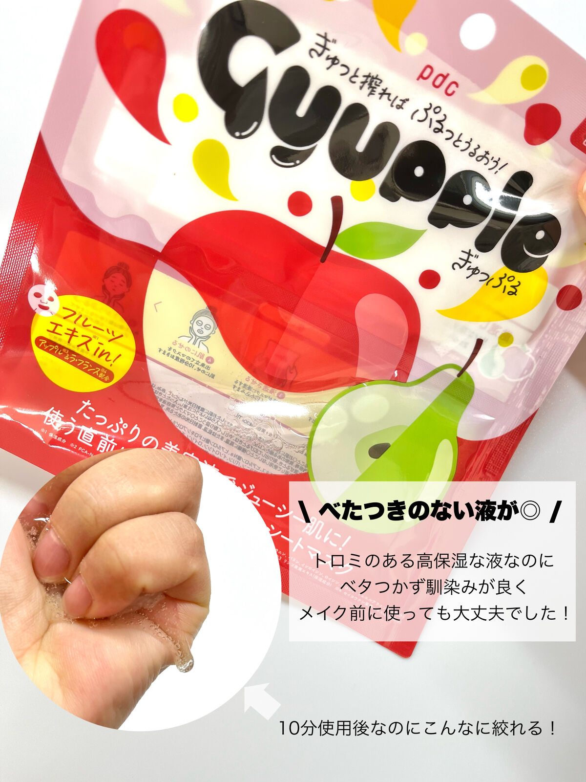 🍎pdcぎゅっぷるエッセンスマスク🍎\ぎゅっと搾れば、ぷるっとうるおう!/1枚30mL/396円(税込価格)美容液1本分の贅沢マスク‼️美容液とドライシートマスクが分離されてて使う直前に搾るフレッシュなパック🥺三つ折にして下の美容液部分を...