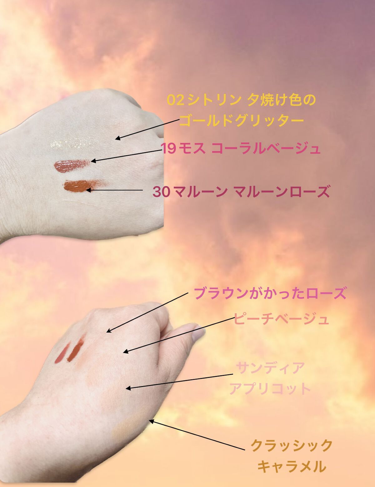 アイシャドウは全部マットリップもマットゴールドグリッターは少量づつ使用して調節して使うのが良さそうです。 アイシャドウ:粉質が柔らかく筆先にサッとのって発色がいい! リップ:マットだけど保湿はされている感じティッシュオフしてもカラーが残る リップに香りがあり、私には苦手な香りでしたT ˙̫ T甘い香りなんですが、、、なんか独特な香りです イエベさんに向いてるけどカラーによってはブルベさんにもいいかもです。