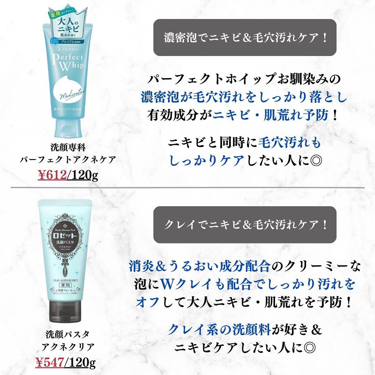 ・メンソレータムアクネス薬用クリーム洗顔:¥570/130g ・メンソレータムアクネス薬用毛穴すっきり粒つぶ洗顔:¥715/130g ・洗顔専科 パーフェクトアクネケア:¥612/120g ・洗顔パスタ アクネクリア:¥547/120g ・肌美精 CHOI 薬用ニキビケア洗顔:¥612/120g ・オルビス クリアフル ウォッシュ:¥1,430/120g ・スキンライフ 薬用洗顔フォーム:¥367/130g ・ファンケル アクネケア 洗顔クリーム:¥1,540/90g ・なめらか本舗 薬用純白泡洗顔:¥880/200ml ・クレンジングリサーチ AHA 薬用アクネ ウォッシュ:¥1,100/120g