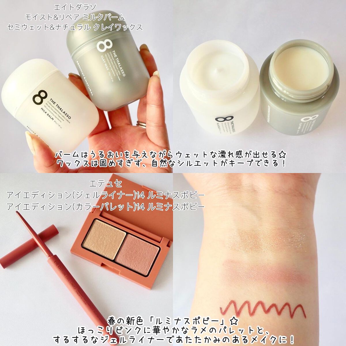 とにかく質感がしーっとりととろけるバームテクスチャーで、保湿力はかなり高い! 少しペタペタもしますが密着力もあるので色持ち良し♪ マスクレスの時にぜひ使いたいぷるぷるでツヤがきれいな仕上がりです。 カラー展開も豊富で、イエベさん向けブルベさん向け揃ってます☆ 私のお気に入りは01と05♡ そして08 Coraliaも可愛くって好き! 6月からドラッグストアにも展開予定だそうですよ♡