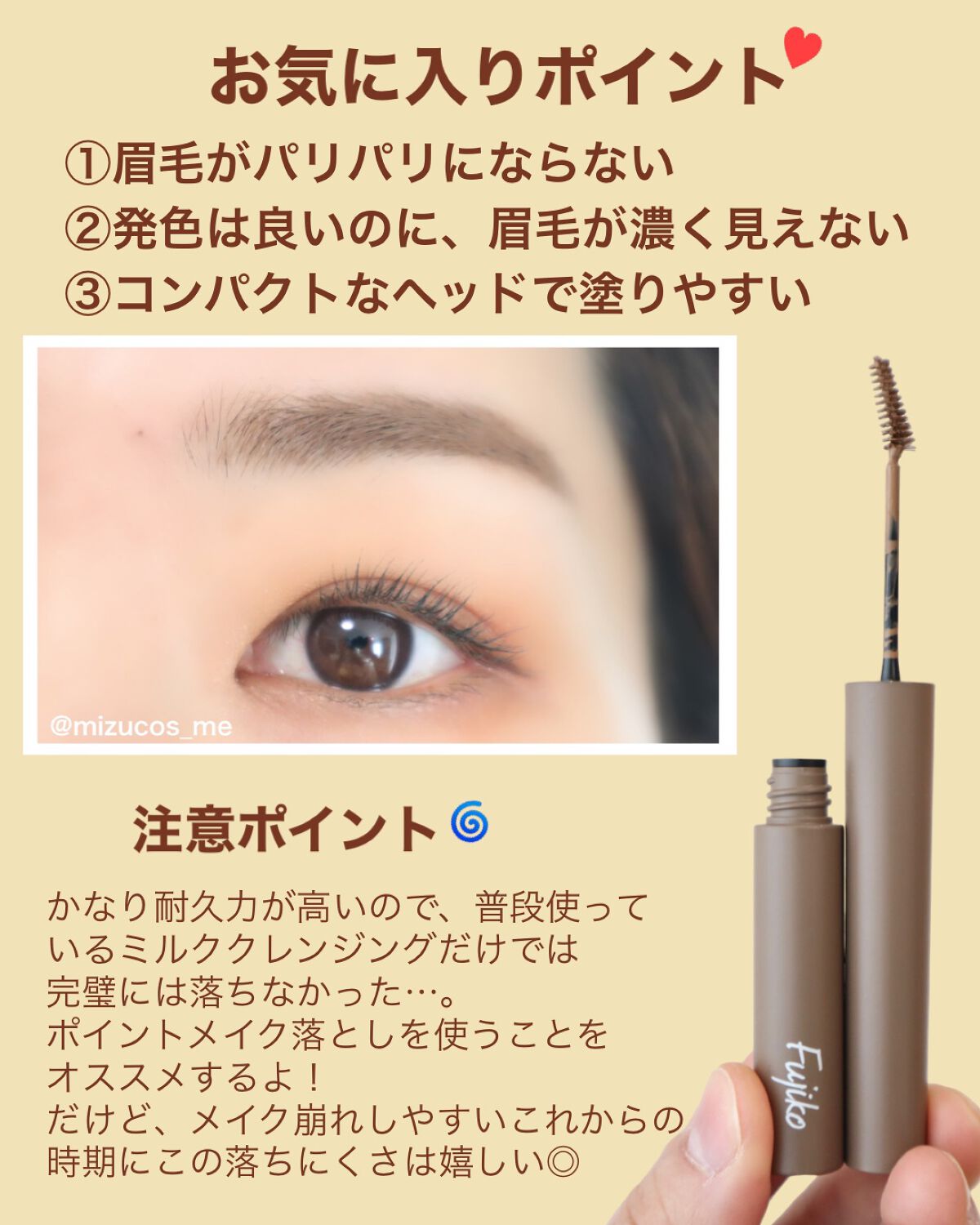 Fujikoの大人気眉マスカラです❁⃘*.゚ ブラシの先が細く曲がっていてめちゃめちゃ塗りやすいです。 101のモカブラウンはピンクみのあるブラウンカラーで一気に眉に抜け感が出て可愛いです♡ 限定色なので今もあるかはわかりませんが見つけたらぜひ使ってみてほしいです!