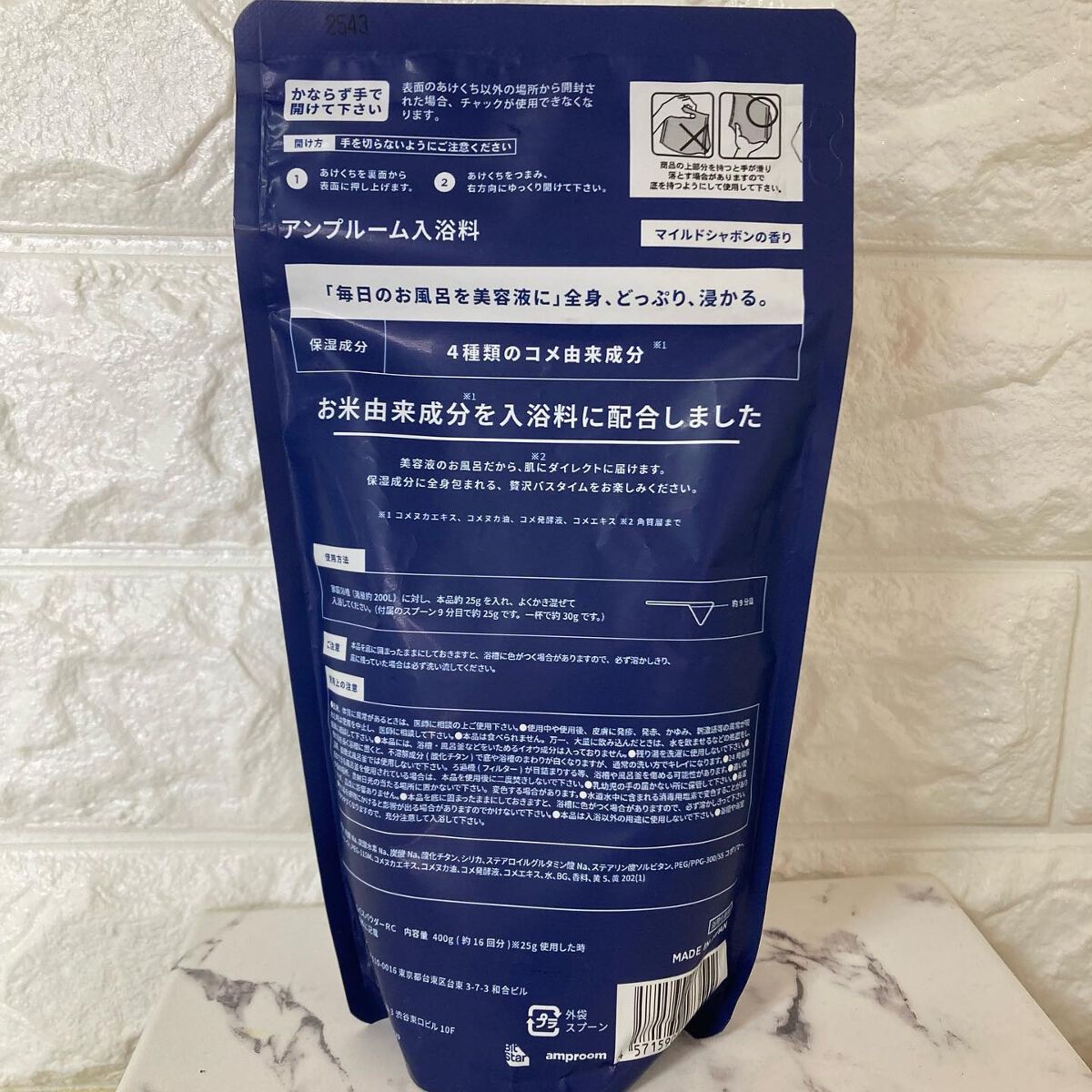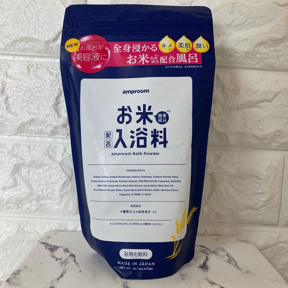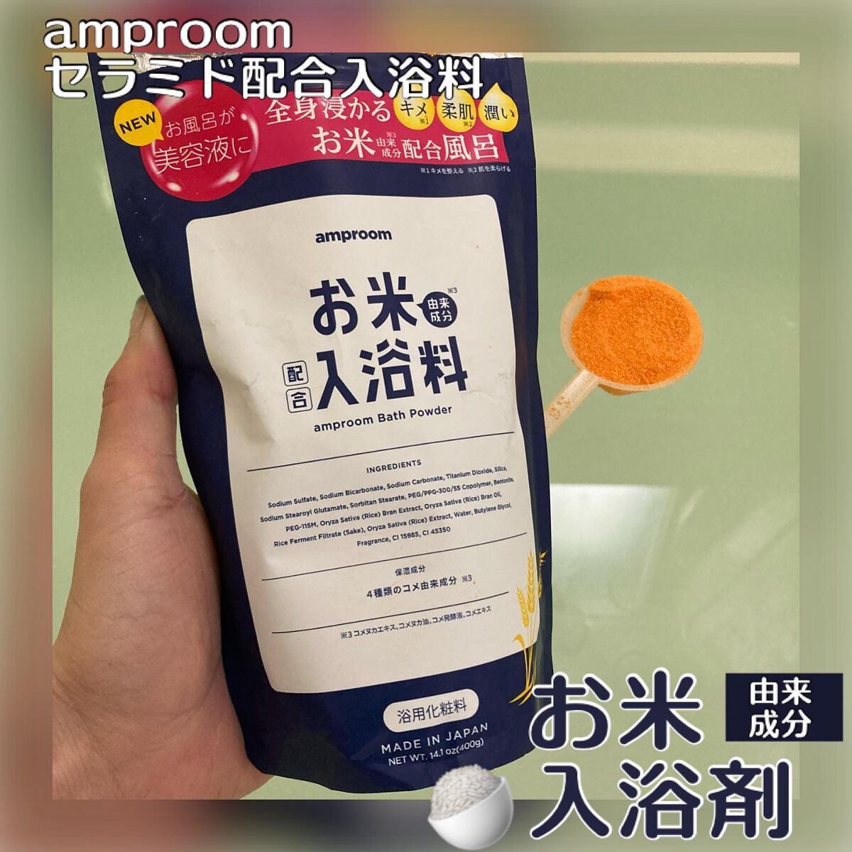 お米でモチモチ!つるつるなめらかで柔らかい肌に導くバスパウダー。 amproom(アンプルーム)は「美容液に浸かる」を実現。 美容成分を入浴剤に配合し、美容液のようなお湯を作り出します。 4種のお米由来成分を贅沢に配合(コメヌカエキス、コメヌカ油、コメ発酵液、コメエキス) 肌に吸い付いてくるまるで美容液のような、なめらかでやわらかな心地よいお湯に浸かり、ふんわりとしたマイルドシャボンの香りで、1日の終わりに至福のひと時を。