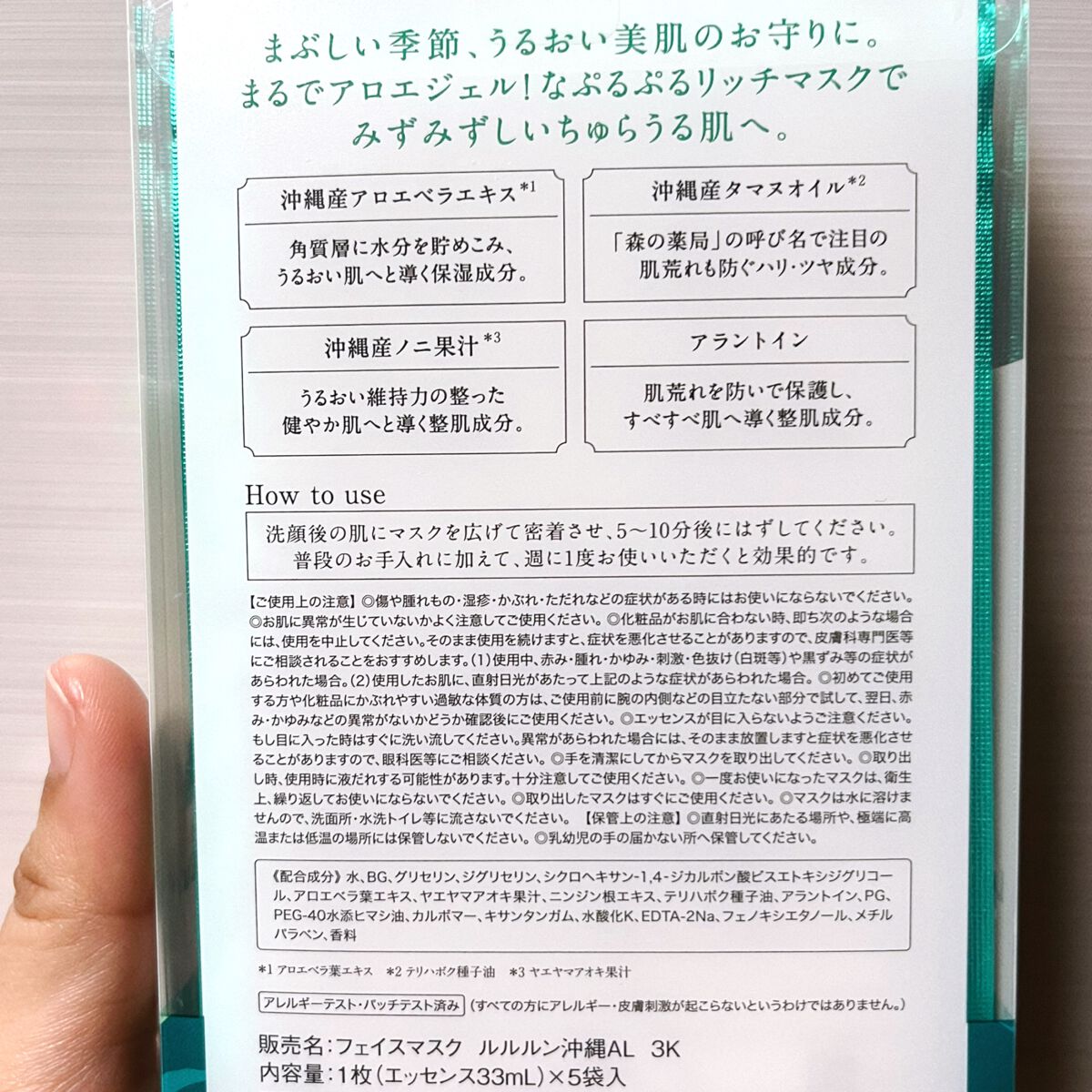 お土産はいつもルルルン🎵荷物の関係で限定5袋タイプに❥・沖縄ルルルン 月桃の香りとアロエの香り🌹シートは安定のしっかりタイプたっぷり美容液入ってます!❥・🌹HowToUse🌹洗顔後のお肌に密着させ10分程度おいた後マスクを折りたたみ拭き取りま...