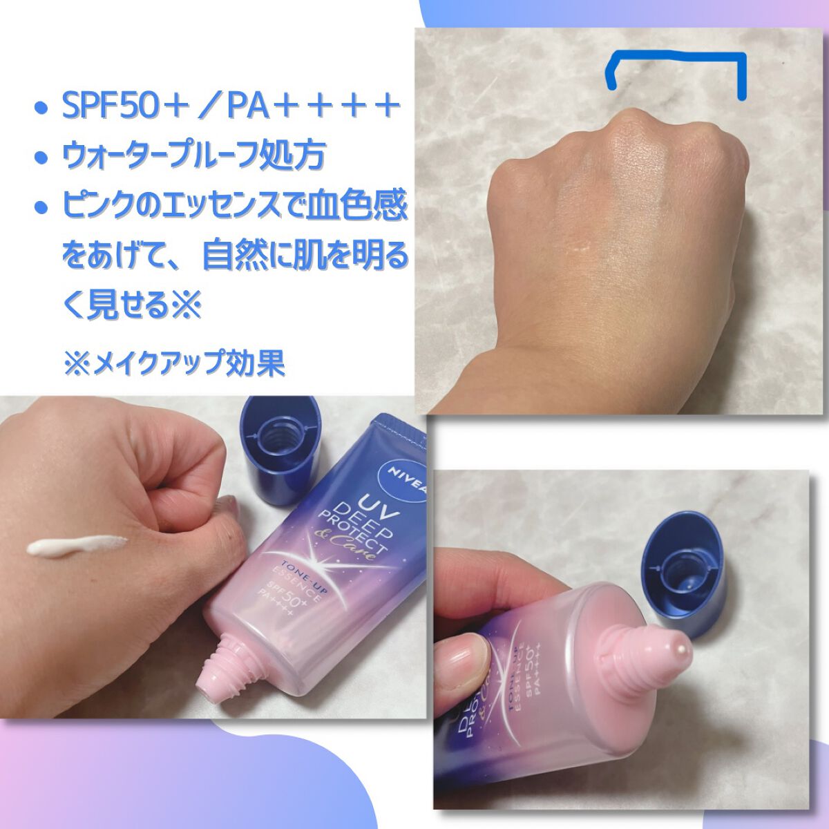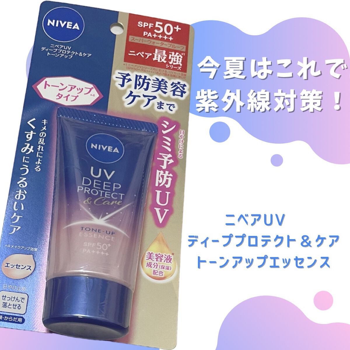 ニベアUVディーププロテクト&ケアトーンアップエッセンスニベア花王からいただきました✨SPF50+・PA++++日やけによるシミ予防*1UV。血色感をUPさせて自然に肌を明るくみせる*2トーンアップエッセンスです。主にシミの原因となるUV-B...