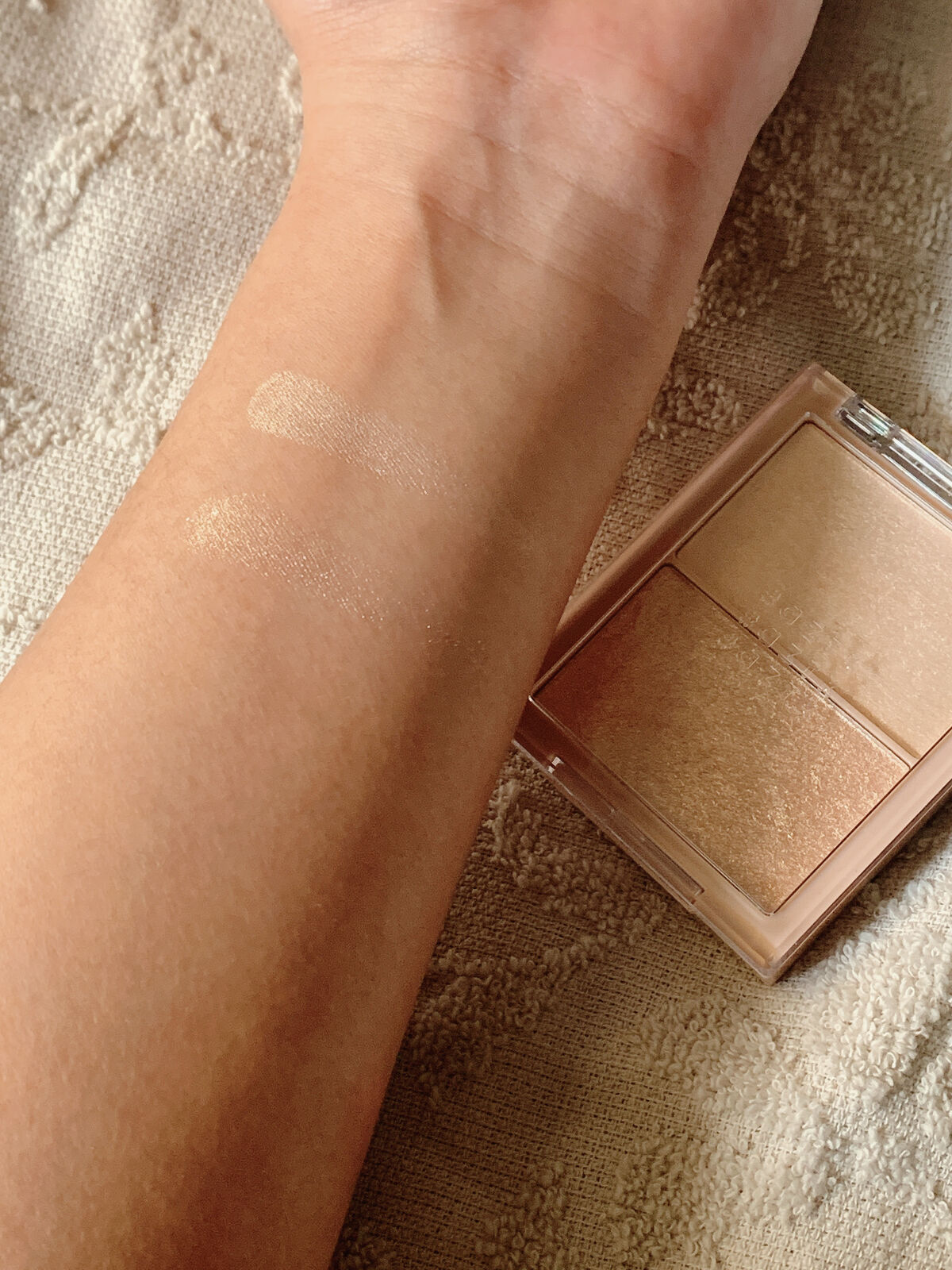 しっとりとした粉質に感動! しっとりとしていて、粉飛びしにくく感じました! 2種類のハイライトが入っていて便利! キラッキラのラメのタイプと、細かいパールがぎっしりと詰まった艶タイプの2種類が1つのパレットに入っています! 500円でこのキラキラ感と艶感はすごいなと思いました! コスパよく、しっかり輝くものを探している方におすすめです!