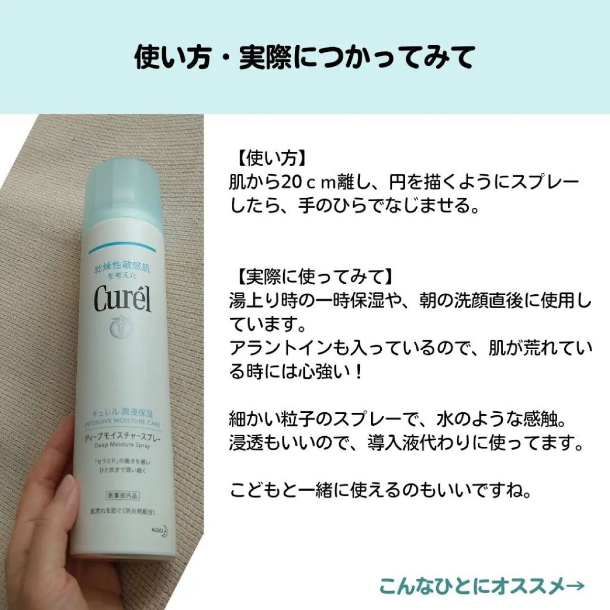 - 【敏感肌用】 微細化したセラミド機能成分*が肌の奥(角層)まで浸透。 ひと吹きで潤ったやわらかな肌に保ちます。 *ヘキサデシロキシPGヒドロキシエチルヘキサデカナミド ●消炎剤配合(有効成分)配合。肌荒れを防ぐ。 ●潤い成分(ユーカリエキス)配合。 ●ケアしづらい背中や腰など、全身に。 ●一日中、顔やからだにいつでもどこでも潤い補給。 お風呂あがりに。メイクの上から。お子さまのデリケートな肌にも。 (医薬部外品) 商品に関するお問い合わせ 受付時間9:00~17:00(土曜・日曜・祝日除く) *製品の誤飲・誤食など緊急の場合は、受付時間外でもお電話ください キュレル:0120-165-698