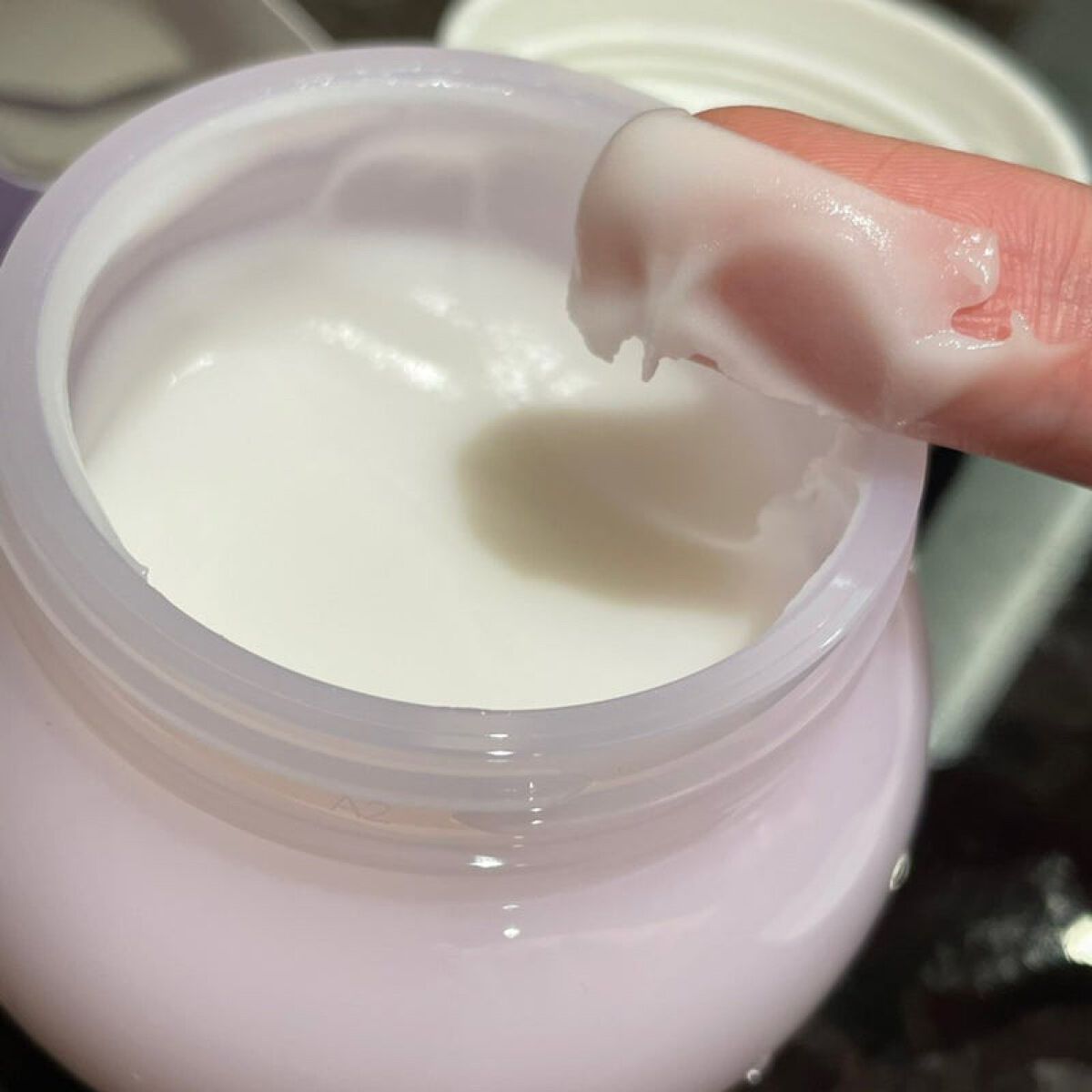 化粧水のあとにこれひとつでケアが完了してしまう優れもの✨ パッケージも、ころんとしたフォルムに紫のカラーがとても可愛いです! クリーム自体は白くて本当にキメの細かいホイップの方な こっくりとしたクリームでした! 塗った後にベタベタするのが苦手でこっくりとしたクリームは あまり使ってきませんでしたが、これは肌に塗るとサラサラと伸びがよく 全然ベタつかなかったです😳🌈 この時点でも驚きだったんですけど、さらに驚いたのが翌日。 起きてからほっぺなどを触るととってもふわふわで「赤ちゃんのような」と パッケージ裏にも書いてありましたがその通りだなと感じました💐💓 乾燥肌なのでこっくりとしたクリームがいいけど、ベタつくのは苦手でって いうわがままな願いを叶えてくれた商品だと思いました🥰 香りも薄らとホワイトティーの匂いがするので香りがキツイのが苦手と言う人でも 大丈夫なものだとおもいます!