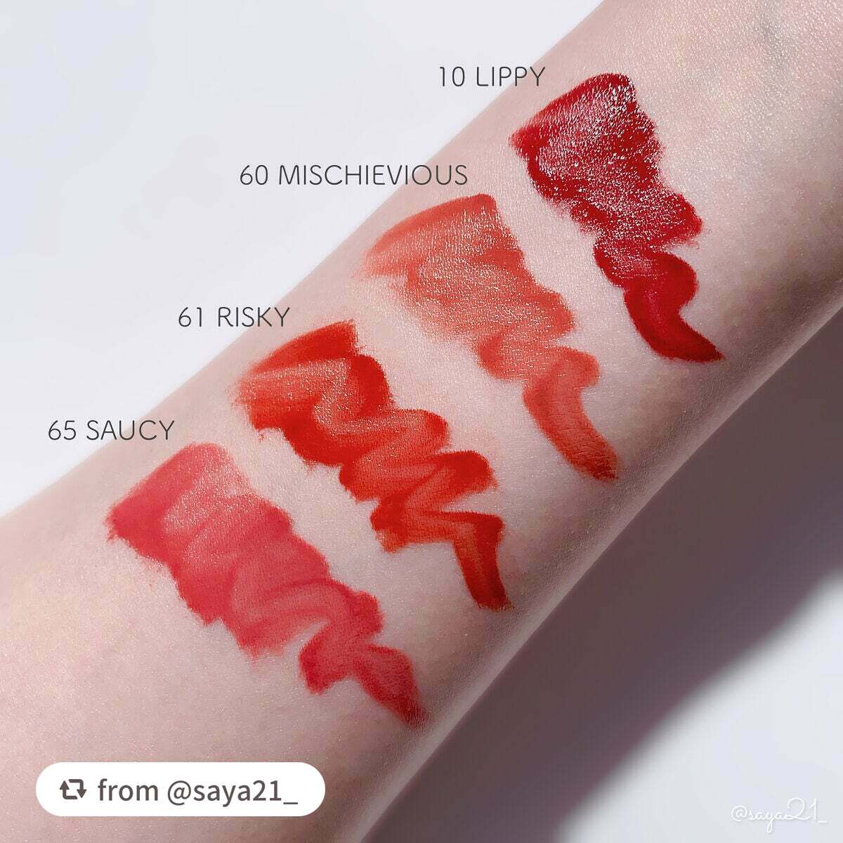 - <10 おしゃべりなヌードルージュ> イソドデカン、ジメチコン、トリメチルシロキシケイ酸、ポリメチルシルセスキオキサン/トリメチルシロキシケイ酸、ポリプロピルシルセスキオキサン、アルキル(C30-45)ジメチルシリルポリプロピルシルセスキオキサン、トリメチルシロキシフェニルジメチコン、トリメチルペンタフェニルトリシロキサン、ビスステアリルジメチコン、ジメチコノール、トリヒドロキシステアリン、フェノキシエタノール、香料、酢酸トコフェロール、エチルヘキシルグリセリン、トリエトキシカプリリルシラン、パルミチン酸イソプロピル、ミリスチン酸イソプロピル、シトロネロール、ゲラニオール、ベンジルアルコール、アロエベラ葉エキス、リナロール、トコフェロール、酸化チタン、酸化鉄、赤202、赤104(1)、アルミナ、黄5、シリカ <23 反抗的なワイルドレッド> イソドデカン、ジメチコン、トリメチルシロキシケイ酸、ポリメチルシルセスキオキサン/トリメチルシロキシケイ酸、ポリプロピルシルセスキオキサン、アルキル(C30-45)ジメチルシリルポリプロピルシルセスキオキサン、トリメチルシロキシフェニルジメチコン、酸化鉄、トリメチルペンタフェニルトリシロキサン、ビスステアリルジメチコン、ジメチコノール、赤202、トリヒドロキシステアリン、フェノキシエタノール、赤230(1)、香料、酢酸トコフェロール、エチルヘキシルグリセリン、トリエトキシカプリリルシラン、パルミチン酸イソプロピル、ミリスチン酸イソプロピル、シトロネロール、ゲラニオール、ベンジルアルコール、アロエベラ葉エキス、リナロール、トコフェロール <37 大胆なオレンジチリ> イソドデカン、ジメチコン、トリメチルシロキシケイ酸、ポリメチルシルセスキオキサン/トリメチルシロキシケイ酸、ポリプロピルシルセスキオキサン、アルキル(C30-45)ジメチルシリルポリプロピルシルセスキオキサン、トリメチルシロキシフェニルジメチコン、トリメチルペンタフェニルトリシロキサン、ビスステアリルジメチコン、ジメチコノール、トリヒドロキシステアリン、フェノキシエタノール、香料、酢酸トコフェロール、エチルヘキシルグリセリン、トリエトキシカプリリルシラン、パルミチン酸イソプロピル、ミリスチン酸イソプロピル、シトロネロール、ゲラニオール、ベンジルアルコール、アロエベラ葉エキス、リナロール、トコフェロール、酸化チタン、酸化鉄、赤202、赤104(1)、アルミナ、黄5、シリカ <53 気まぐれなバーガンディピンク> イソドデカン、ジメチコン、トリメチルシロキシケイ酸、ポリメチルシルセスキオキサン/トリメチルシロキシケイ酸、ポリプロピルシルセスキオキサン、アルキル(C30-45)ジメチルシリルポリプロピルシルセスキオキサン、トリメチルシロキシフェニルジメチコン、トリメチルペンタフェニルトリシロキサン、ビスステアリルジメチコン、ジメチコノール、トリヒドロキシステアリン、フェノキシエタノール、香料、酢酸トコフェロール、エチルヘキシルグリセリン、トリエトキシカプリリルシラン、パルミチン酸イソプロピル、ミリスチン酸イソプロピル、シトロネロール、ゲラニオール、ベンジルアルコール、アロエベラ葉エキス、リナロール、トコフェロール、酸化チタン、酸化鉄、赤202、赤104(1)、アルミナ、黄5、シリカ <60 お茶目なヌードローズベージュ> イソドデカン、ジメチコン、トリメチルシロキシケイ酸、ポリメチルシルセスキオキサン/トリメチルシロキシケイ酸、ポリプロピルシルセスキオキサン、アルキル(C30-45)ジメチルシリルポリプロピルシルセスキオキサン、トリメチルシロキシフェニルジメチコン、トリメチルペンタフェニルトリシロキサン、ビスステアリルジメチコン、ジメチコノール、トリヒドロキシステアリン、フェノキシエタノール、香料、酢酸トコフェロール、エチルヘキシルグリセリン、トリエトキシカプリリルシラン、パルミチン酸イソプロピル、ミリスチン酸イソプロピル、シトロネロール、ゲラニオール、ベンジルアルコール、アロエベラ葉エキス、リナロール、トコフェロール、酸化チタン、酸化鉄、赤202、赤104(1)、アルミナ、黄5、シリカ <61 危険なマホガニーブラウン> イソドデカン、ジメチコン、トリメチルシロキシケイ酸、ポリメチルシルセスキオキサン/トリメチルシロキシケイ酸、ポリプロピルシルセスキオキサン、アルキル(C30-45)ジメチルシリルポリプロピルシルセスキオキサン、トリメチルシロキシフェニルジメチコン、トリメチルペンタフェニルトリシロキサン、ビスステアリルジメチコン、ジメチコノール、トリヒドロキシステアリン、フェノキシエタノール、香料、酢酸トコフェロール、エチルヘキシルグリセリン、トリエトキシカプリリルシラン、パルミチン酸イソプロピル、ミリスチン酸イソプロピル、シトロネロール、ゲラニオール、ベンジルアルコール、アロエベラ葉エキス、リナロール、トコフェロール