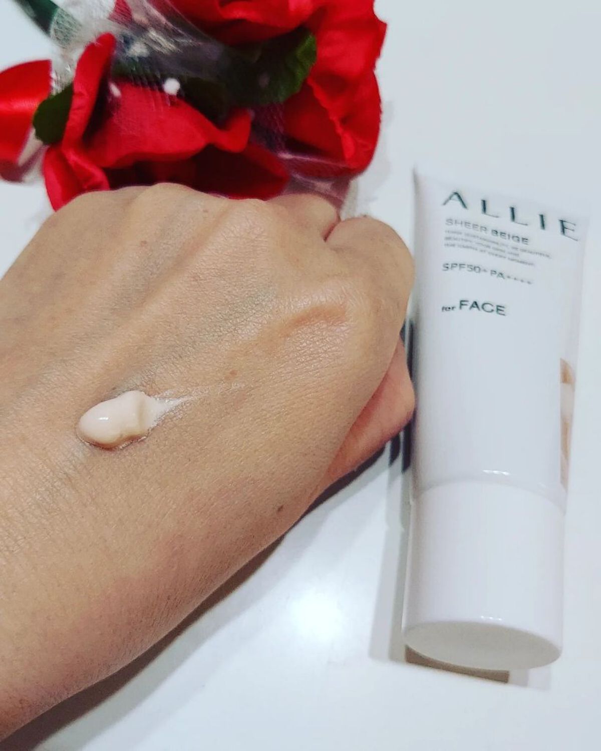 手に出すととってもやわらかなテクスチャーで、ほんのりパープルのクリームがでます。 香りもとっても良くてほのかに香る、お気に入りです。 色ムラ補正とUVカットの両方に期待したいです!