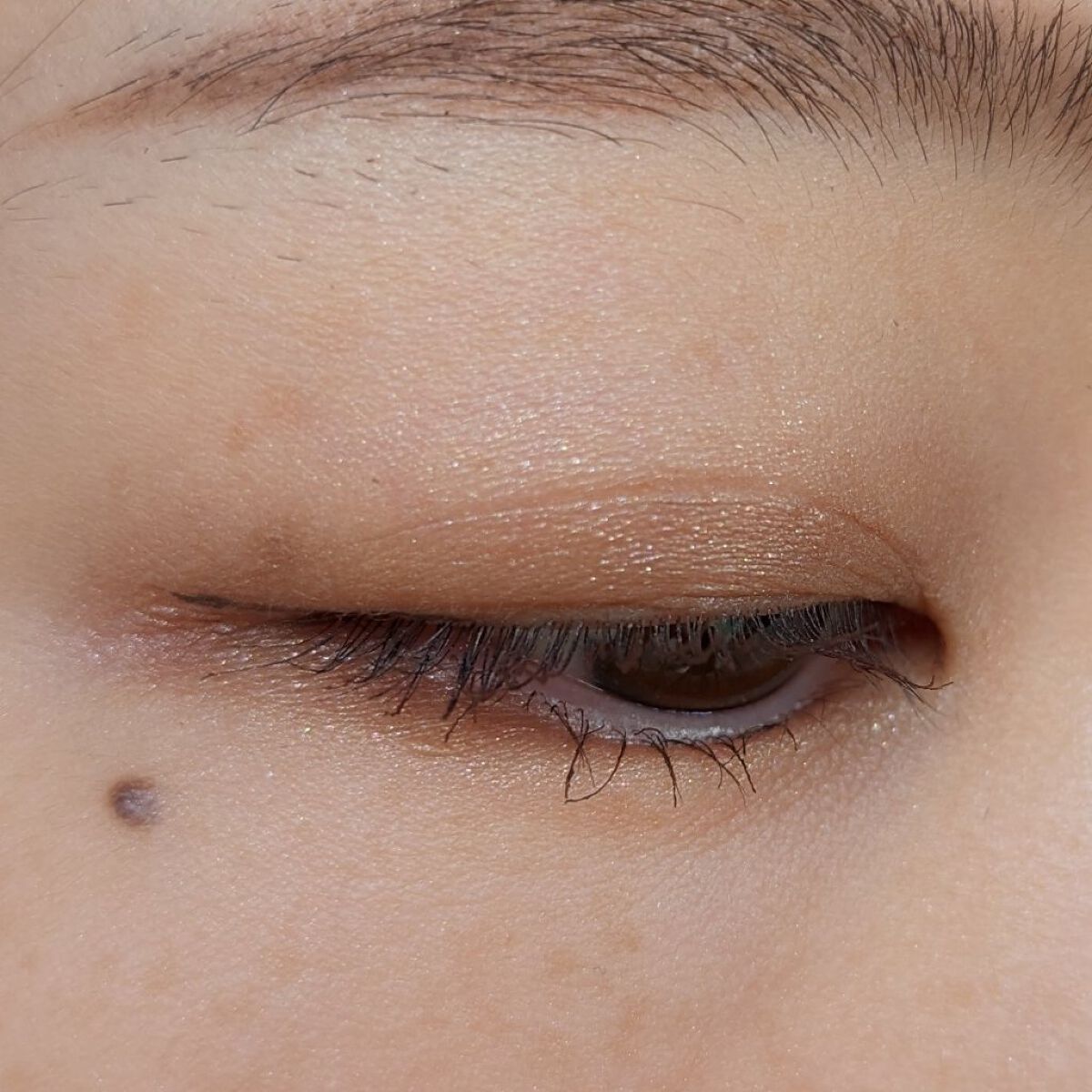 一見、ブルーが強く出そうで難しそうな見た目ですが、塗ってみるとほぼブルーは感じず、まるで濡れツヤハイライトのようなカラー♡ 多色ラメですが、ゴールドラメが目立ちます。 まぶたに乗せると結構ギラギラするので、普段使いだと量は調節が必要そうです。