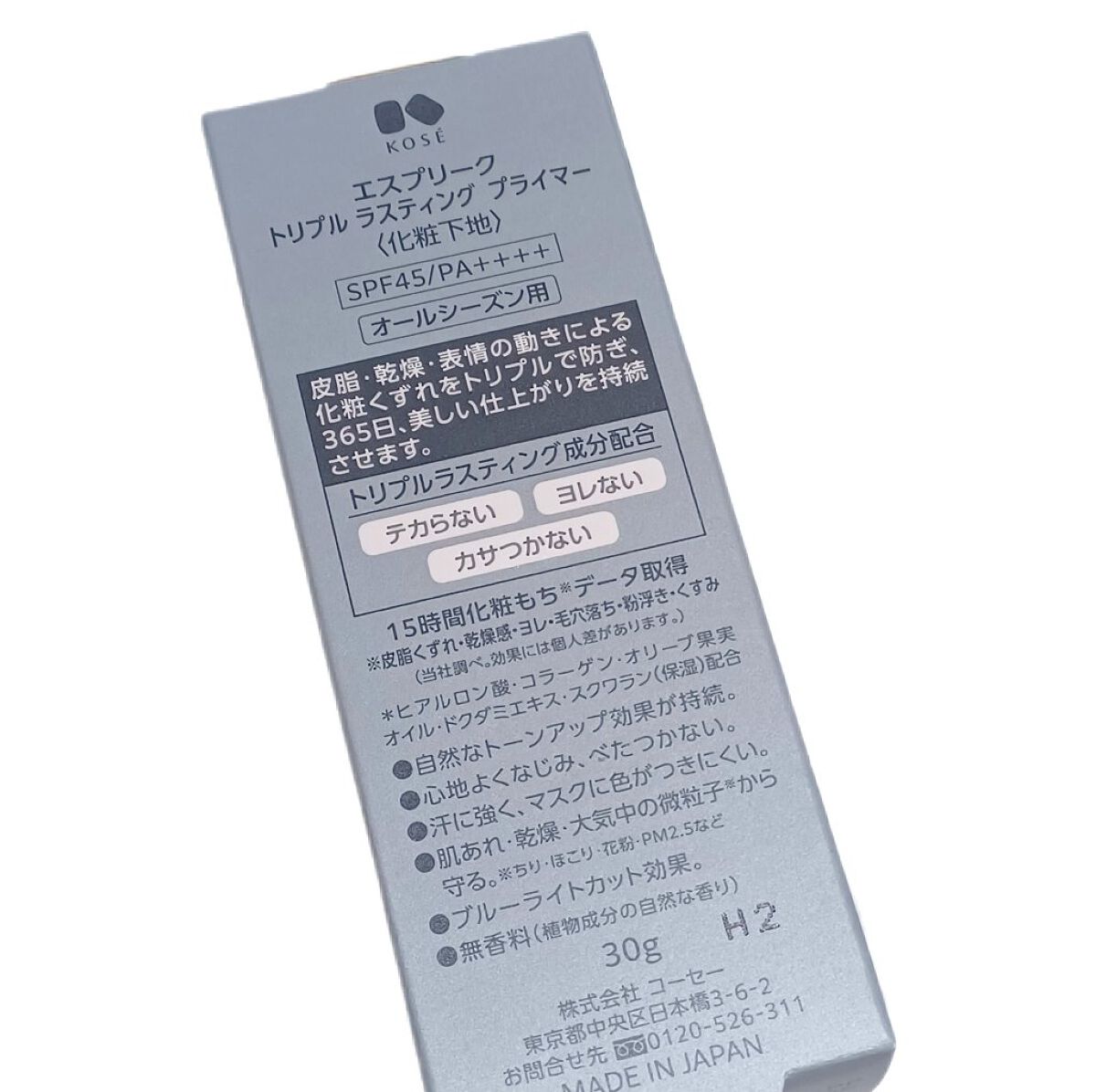 - SPF45 / PA++++ ■ 世界初*の成分アプローチで、皮脂によるテカリ、乾燥によるカサつき、表情の動きによるヨレをトリプルで防ぐ化粧下地です。 優れた化粧もちを叶え、365日、美しい仕上がりを持続させます。 ■トリプルラスティング成分配合。 1日中、テカり・乾燥・ヨレによるくずれを防ぎ、カサつき感もありません。 ■ どんな肌色の方にもなじむ自然なピンクベージュカラーで、自然なトーンアップ効果が持続します。 ■ のび広がりよく心地よくなじむのに、べたつきません。 ■ 汗・水に強く、マスクに色がつきにくい処方です。 ■ 肌あれ・乾燥・大気中の微粒子※から肌を守ります。※ちり・ほこり・花粉・PM2.5など ■ ブルーライトカット効果。 ■ 15時間化粧もちデータ取得※皮脂くずれ・乾燥感・ヨレ・毛穴落ち・粉浮き・くすみ (当社調べ。効果には個人差があります。) ■ オールシーズン用 ■ 無香料(植物成分の自然な香り) ■ パッチテスト済み すべてのかたに皮膚刺激が起きないというわけではありません。 *「皮膜形成性をもつ(ジメチコン/ビニルトリメチルシロキシケイ酸)クロスポリマー」 と「ヒドロキシアパタイト及び酸化亜鉛及び水添レシチンを被覆した粉体」の組合せが世界初先行技術調査及びMintel社データベース内 2022年11月 当社調べ