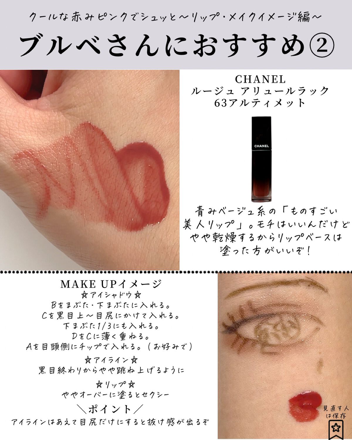 発色は申し分なしでおしゃんカラーにきゅん。 おすすめの塗り方はリップを塗ったら「2分待って」ティッシュオフする ちゃんと唇に定着させる時間をあげることでぐっとマスクに着きにくくなる! でも、やっぱり直で塗ると乾燥する😢かといってリップ下地を塗ってから塗ると色持ちがうーん。