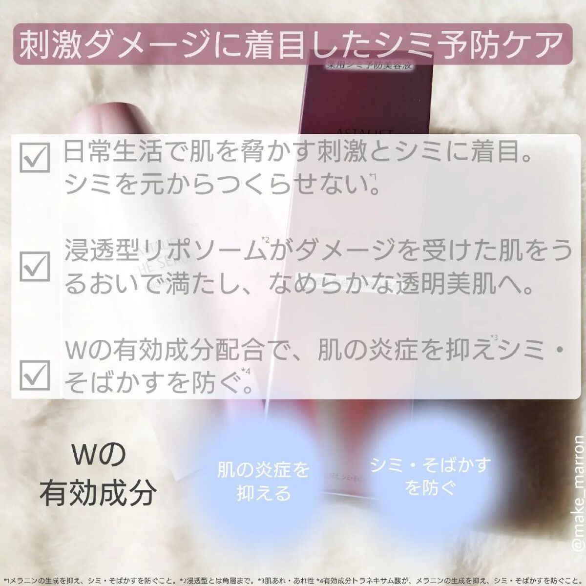 富士フイルムのリポソーム技術を採用した美白*美容液!◻️ASTALIFTザセラムブライトニング¥7,150(税込)紫外線以外にもマスクによる摩擦や乾燥、ニキビ、洗顔による摩擦やメイク落としによる摩擦など日常生活に潜む肌への刺激とシミの発生に着...