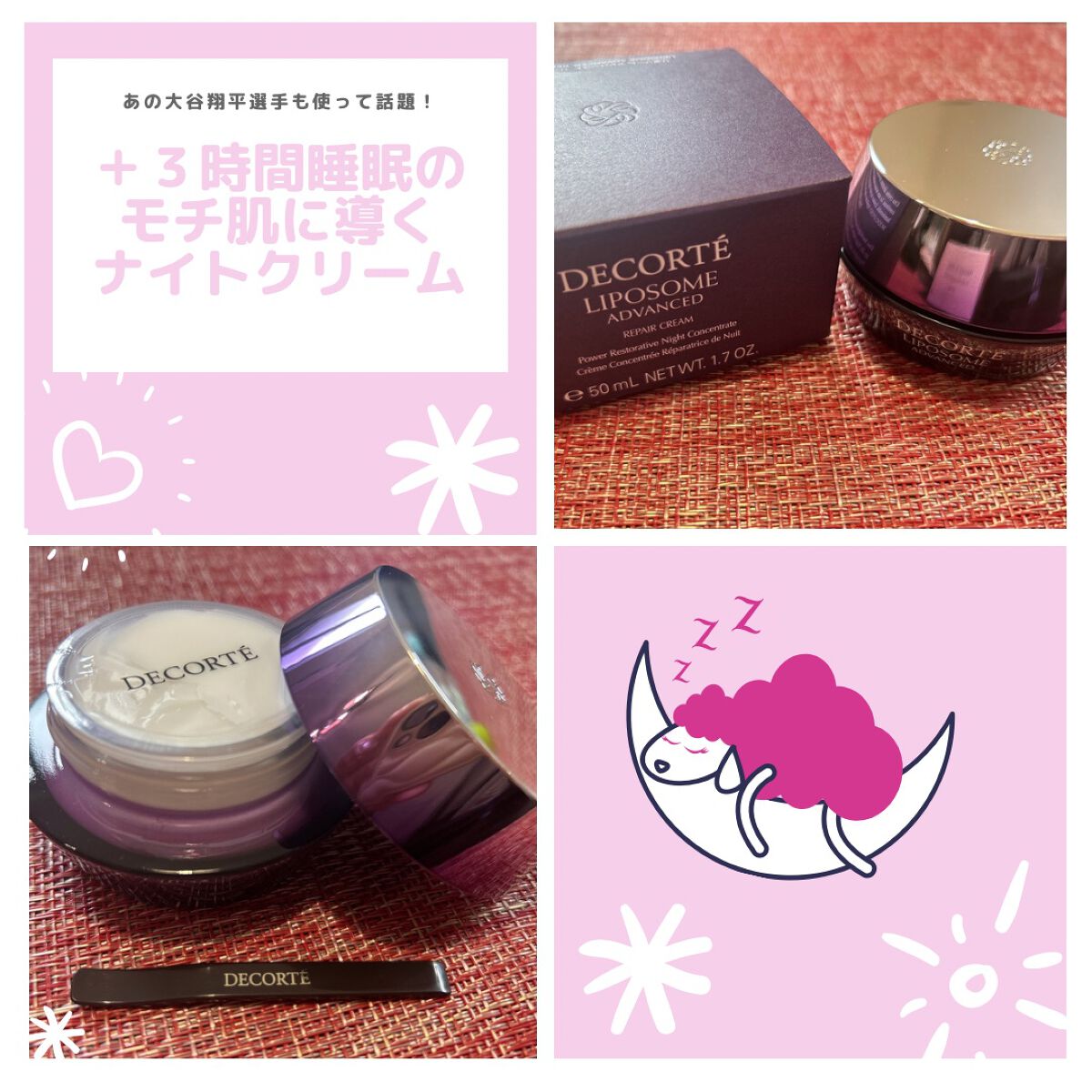 睡眠不足でも、3時間多く眠ったような肌へ。 なんて素敵なキャッチコピー♡ 1gのクリームに1兆個のナイトカプセルが肌をかけめぐりながら美を放ち肌の可能性を引き出すまさしく進化系ナイトクリーム💎 保湿力がすごく高いのに重くない! 伸びも肌馴染みも良いテクスチャもお気に入りー🩷