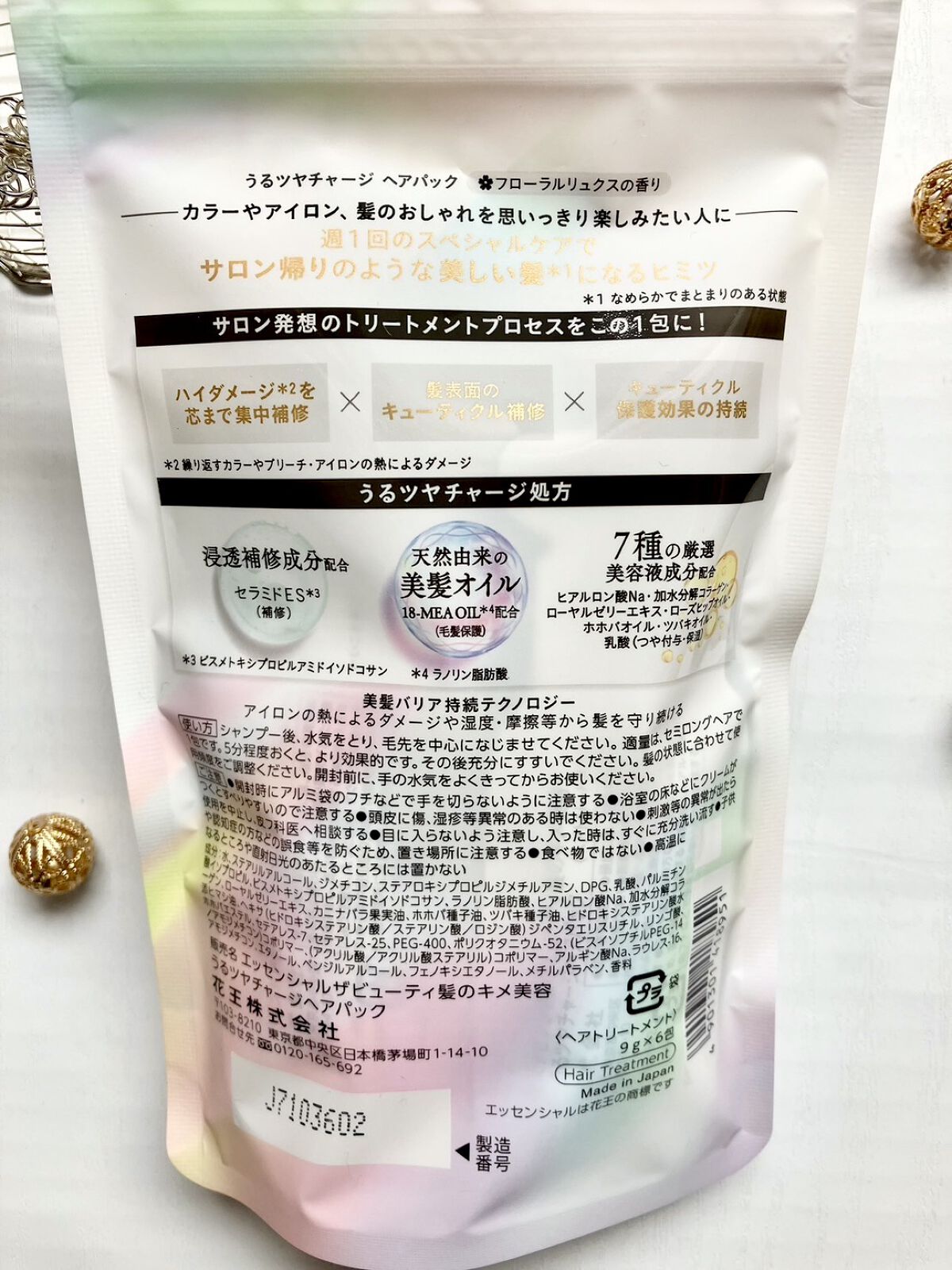 - ○カラーやアイロン、髪のおしゃれを思いっきり楽しみたい人に ○週1回のスペシャルケアで、サロン帰りのような美しい髪*へ(*なめらかでまとまりのある状態) 〇サロン発想のトリートメントプロセスがこの1包に! ○サロンのトリートメントプロセス ・ハイダメージ*を芯まで集中補修。(*繰り返すカラーやブリーチ・アイロンの熱によるダメージ) ・髪表面のキューティクルを補修 ・キューティクルの保護効果の持続 〇うるツヤチャージ処方 ・浸透補修成分配合:セラミドES*(補修)(*ビスメトキシプロピルアミドイソドコサン) ・天然由来の美髪オイル18-MEA OIL*配合(毛髪保護)(*ラノリン脂肪酸) ・7種の厳選美容液成分配合:ヒアルロン酸Na・加水分解コラーゲン・ローヤルゼリーエキス・ローズヒップオイル・ホホバホイル・ツバキオイル・乳酸(つや付与・保湿) 〇アイロン熱による髪ダメージや温度・摩擦等から髪を守り続ける”美髪バリア持続テクノロジー” 〇フローラルリュクスの香り