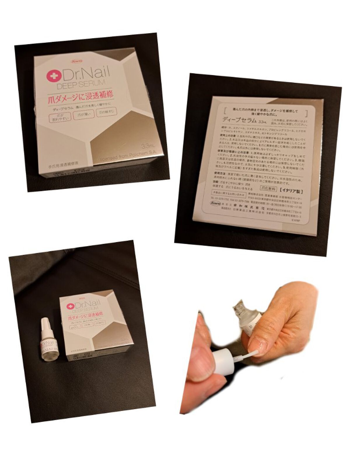 傷んだ爪の内側まで浸透し、ダメージを補修して強く健やかな爪に導いてくれます。 爪が割れやすい 爪が薄い 詰の縦すじがきになるかたにおすすめです。 3.3mlの美容液。 サイズ的には目薬サイズです。 蓋の部分がマニキュアのハケのようになっていて、 自爪の表面に 爪の根元から一方向に塗るだけです。 さらっとした美容液で 塗りやすいです。 水溶性なので、就寝前など 長時間水に触れないときにぬるのがおすすめですよ♡ ジェルネイルやマニキュアをしている人は 伸びた根元や 爪の裏側に使うこともできますよ。 2週間〜1ヶ月程度で変化を感じられるようなので、使い続けてみます。