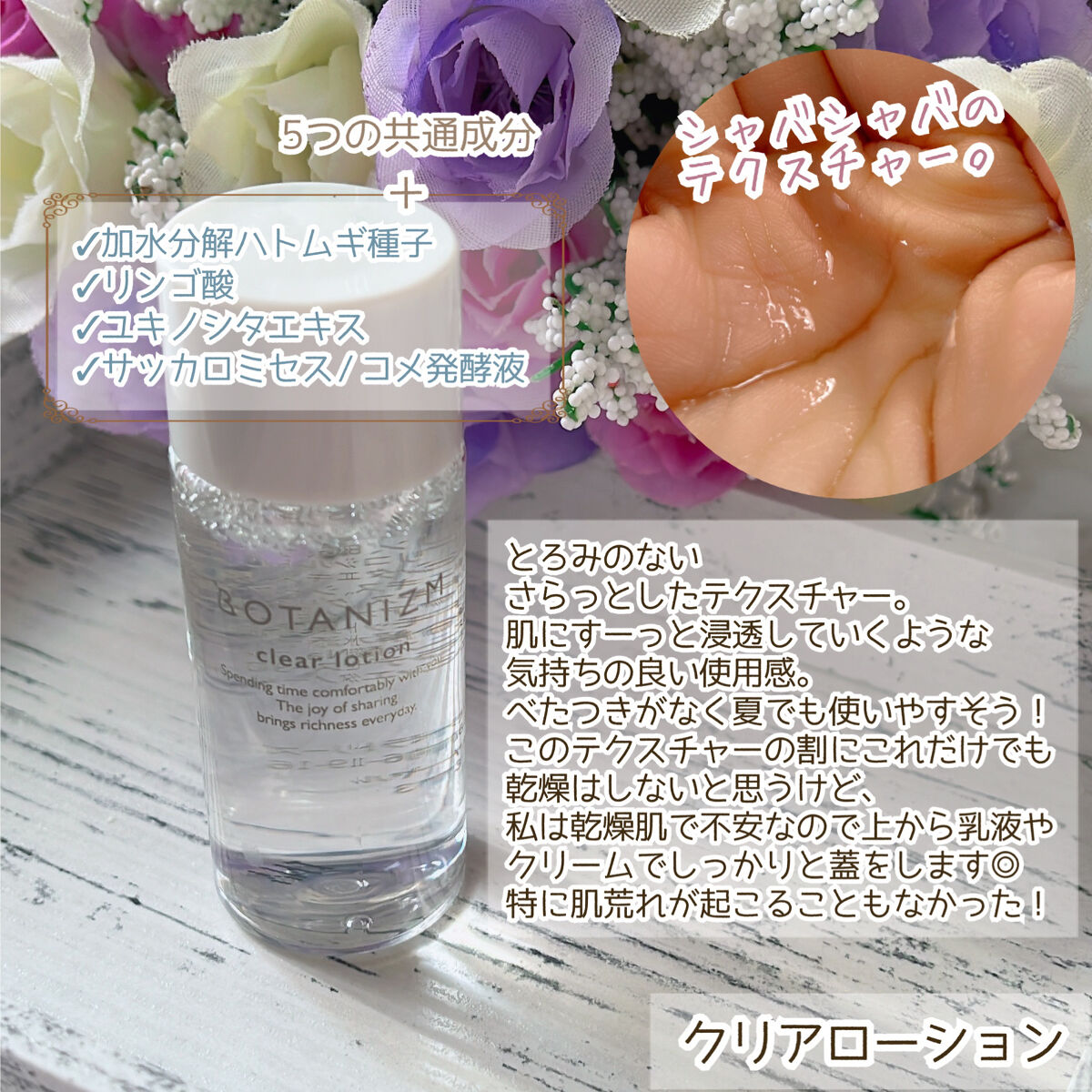 - 【ボタニズム クレンジングバター】 パルミチン酸エチルヘキシル、水、イソノナン酸イソトリデシル、ステアリン酸ポリグリセリル-10、イソステアリン酸PEG-6、ツバキ種子油、チャ葉エキス、ウメ果実エキス、シャクヤク根エキス、メリッサ葉エキス、フラーレン、グリチルリチン酸2K、カボス果皮油、ユズ果皮油、オレンジ果皮油、イヨカン果皮油、コウヤマキ枝/葉油、BG、トコフェロール、ステアリン酸グリセリル(SE)、ラウロイルメチルタウリンNa、酸化鉄、シリカ、PVP、エチルヘキシルグリセリン、ポリアミノプロピルビグアニド 【ボタニズム クレイウォッシュ】 水、グリセリン、BG、パルミチン酸エチルヘキシル、ベントナイト、コカミドプロピルベタイン、グリコシルトレハロース、ココイルグルタミン酸Na、海シルト、オリーブ葉エキス、ウメ果実エキス、シャクヤク根エキス、チャ葉エキス、メリッサ葉エキス、グリチルリチン酸2K、カボス果皮油、ユズ果皮油、オレンジ果皮油、イヨカン果皮油、コウヤマキ枝/葉油、グルコマンナン、加水分解水添デンプン、ラウロイルグルタミン酸ジ(フィトステリル/オクチルドデシル)、ダイマージリノール酸ダイマージリノレイルビス(ベヘニル/イソステアリル/フィトステリル)、クエン酸Na、クエン酸、乳酸、キサンタンガム、エチルヘキシルグリセリン、ペンテト酸5Na、ステアリン酸グリセリル、ミリスチン酸ポリグリセリル-10、セタノール、フェノキシエタノール 【ボタニズム クリアローション】 水、グリセリン、BG、サッカロミセス/コメ発酵液、ジグリセリン、グリコシルトレハロース、加水分解ハトムギ種子、ユキノシタエキス、乳酸桿菌/ダイコン根発酵液、ウメ果実エキス、シャクヤク根エキス、メリッサ葉エキス、チャ葉エキス、グリチルリチン酸2K、アラントイン、ニオイテンジクアオイ油、ダマスクバラ花油、パルマローザ油、ベルガモット果実油、ローズマリー葉油、カボス果皮油、加水分解水添デンプン、リンゴ酸、クエン酸Na、クエン酸、アニス酸Na、フィチン酸、レブリン酸Na、PPG-6デシルテトラデセス-30、ヤシ油脂肪酸PEG-7グリセリル、フェノキシエタノール 【ボタニズム エッセンスミルク】 水、サッカロミセス/コメ発酵液、プロパンジオール、グリセリン、スクワラン、トリ(カプリル酸/カプリン酸)グリセリル、ペンチレングリコール、ジグリセリン、BG、乳酸桿菌/ダイコン根発酵液、キハダ樹皮エキス、セラミドAG、セラミドAP、セラミドNG、セラミドEOP、セラミドNP、メリッサ葉エキス、チャ葉エキス、シャクヤク根エキス、ウメ果実エキス、グリチルリチン酸2K、ニオイテンジクアオイ油、ダマスクバラ花油、パルマローザ油、ベルガモット果実油、ローズマリー葉油、カボス果皮油、グリコシルトレハロース、フィトステロールズ、キサンタンガム、加水分解水添デンプン、エチドロン酸4Na、フィチン酸、ペンタステアリン酸ポリグリセリル-10、イソステアリン酸ポリグリセリル-10、水添レシチン、ステアロイルラクチレートNa、カルボマー、ベヘニルアルコール、トコフェロール、水酸化Na、フェノキシエタノール