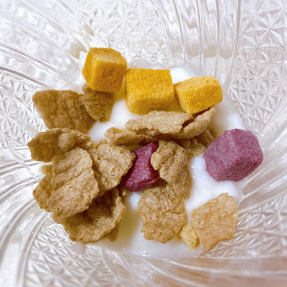 大豆と野菜をシリアルに 2種の大豆フレークと4種の野菜キューブ。サクサクとしたクリスピー食感と素材本来の美味しさ。 植物性たんぱく質と食物繊維がとれる 1食分30gで、タンパク質15.8g・食物繊維6.7g、糖質は3.9gです。 甘さをおさえているので、色んな味わいが楽しめます そのままでも、牛乳や植物性ミルクと、サラダやスープに加えても。