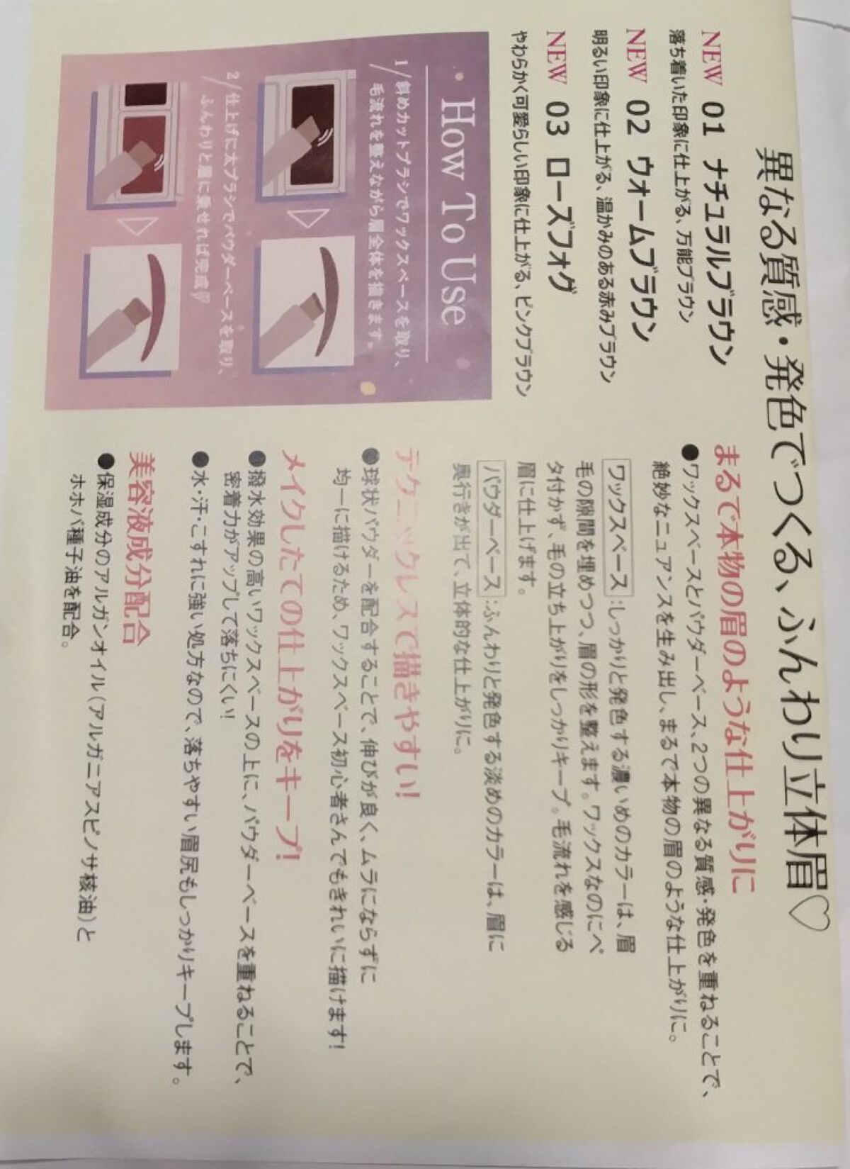 - ワックス×パウダー 異なる質感で作るふんわり立体眉 ワックスベースとパウダーベース、2つの異なる質感・発色を重ねることで、 絶妙なニュアンスを生み出しまるで本物の眉のような仕上がりに。 ワックスベースの上にパウダーベースを重ねることで、密着力がUP! メイクしたての仕上がりをキープできます! ◆ワックスベース◆ しっかりと発色する濃いめのカラーは、眉毛の隙間を埋めつつ眉の形を整えます。 ワックスなのにベタつかず、毛の立ち上がりをしっかりキープ。毛流れを感じる眉に仕上がります。 ★伸びが良くムラになりにくいため、初心者さんでも描きやすい! ◆パウダーベース◆ ふんわりと発色する淡めのカラーは、眉に奥行きが出て、立体的に仕上がります。