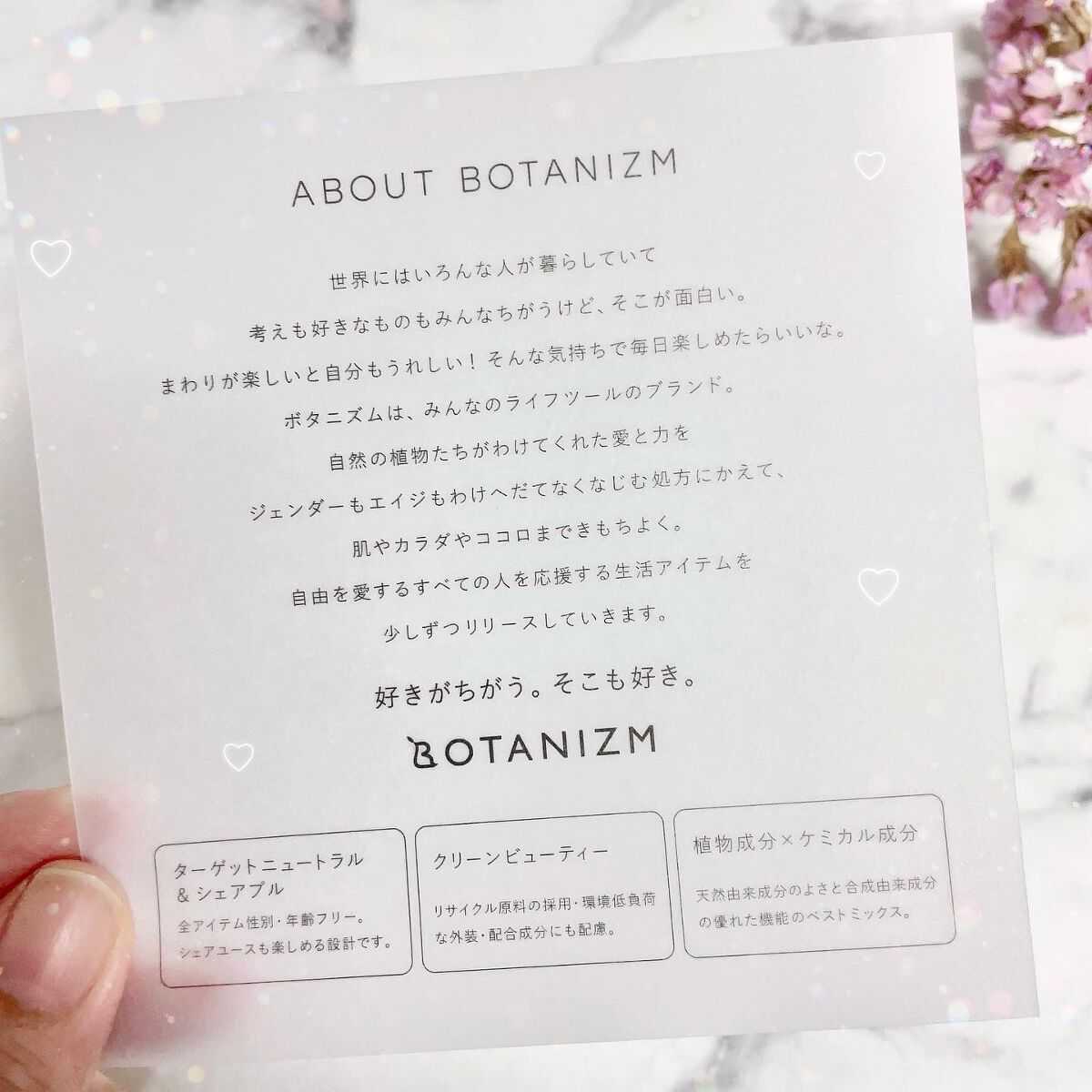 ボタニズムってどんなブランド? 植物✕ケミカル成分の組み合わせで作られていて、それぞれの良いところを取り入れている。中でも、肌のハリ不⾜に注⽬していて、レモンバームエキスをはじめとする国産の植物成分を配合している。 香りは天然精油を使用している。柑橘系の香りで、ジェンダーレスに使用できる。