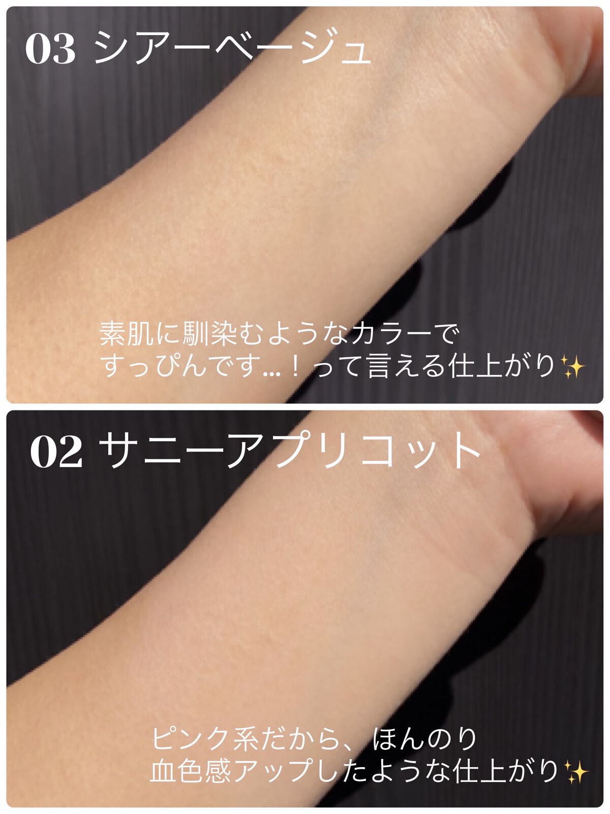 - <01 アンニュイパープル> 水、エタノール、セバシン酸ジイソプロピル、酸化チタン、トリエチルヘキサノイン、酸化亜鉛、ジメチコン、グリセリン、エチルヘキシルトリアゾン、BG、ポリシリコーン-15、ベヘニルアルコール、ビスエチルヘキシルオキシフェノールメトキシフェニルトリアジン、含水シリカ、ジエチルアミノヒドロキシベンゾイル安息香酸ヘキシル、水添レシチン、タルク、(アクリル酸Na/アクリロイルジメチルタウリンNa)コポリマー、トリエトキシカプリリルシラン、イソヘキサデカン、(アクリレーツ/メタクリル酸ポリトリメチルシロキシ)コポリマー、ポリソルベート80、キサンタンガム、水酸化Al、トリイソステアリン酸イソプロピルチタン、香料、EDTA-2Na、ラウロイルアスパラギン酸Na、ラウロイルリシン、塩化亜鉛、ヒアルロン酸Na、グンジョウ、赤226 香り・色・味 <02 サニーアプリコット> 水、エタノール、セバシン酸ジイソプロピル、酸化チタン、トリエチルヘキサノイン、酸化亜鉛、ジメチコン、グリセリン、エチルヘキシルトリアゾン、BG、ポリシリコーン-15、ベヘニルアルコール、ビスエチルヘキシルオキシフェノールメトキシフェニルトリアジン、含水シリカ、ジエチルアミノヒドロキシベンゾイル安息香酸ヘキシル、水添レシチン、タルク、(アクリル酸Na/アクリロイルジメチルタウリンNa)コポリマー、トリエトキシカプリリルシラン、イソヘキサデカン、(アクリレーツ/メタクリル酸ポリトリメチルシロキシ)コポリマー、ポリソルベート80、香料、キサンタンガム、水酸化Al、トリイソステアリン酸イソプロピルチタン、EDTA-2Na、ラウロイルアスパラギン酸Na、塩化亜鉛、ヒアルロン酸Na、酸化鉄 <03 シアーベージュ> 水、エタノール、セバシン酸ジイソプロピル、酸化チタン、トリエチルヘキサノイン、酸化亜鉛、ジメチコン、グリセリン、エチルヘキシルトリアゾン、BG、ポリシリコーン-15、ベヘニルアルコール、ビスエチルヘキシルオキシフェノールメトキシフェニルトリアジン、含水シリカ、ジエチルアミノヒドロキシベンゾイル安息香酸ヘキシル、水添レシチン、タルク、(アクリル酸Na/アクリロイルジメチルタウリンNa)コポリマー、トリエトキシカプリリルシラン、イソヘキサデカン、(アクリレーツ/メタクリル酸ポリトリメチルシロキシ)コポリマー、ポリソルベート80、キサンタンガム、水酸化Al、トリイソステアリン酸イソプロピルチタン、香料、EDTA-2Na、ラウロイルアスパラギン酸Na、塩化亜鉛、ヒアルロン酸Na、酸化鉄 <03 限定パッケージK(星のカービィ) 40g> 水、エタノール、セバシン酸ジイソプロピル、酸化チタン、トリエチルヘキサノイン、酸化亜鉛、ジメチコン、グリセリン、エチルヘキシルトリアゾン、BG、ポリシリコーン-15、ベヘニルアルコール、ビスエチルヘキシルオキシフェノールメトキシフェニルトリアジン、含水シリカ、ジエチルアミノヒドロキシベンゾイル安息香酸ヘキシル、水添レシチン、タルク、(アクリル酸Na/アクリロイルジメチルタウリンNa)コポリマー、トリエトキシカプリリルシラン、イソヘキサデカン、(アクリレーツ/メタクリル酸ポリトリメチルシロキシ)コポリマー、ポリソルベート80、キサンタンガム、水酸化Al、トリイソステアリン酸イソプロピルチタン、香料、EDTA-2Na、ラウロイルアスパラギン酸Na、塩化亜鉛、ヒアルロン酸Na、酸化鉄 <03 限定パッケージS(2024) 40g> 水、エタノール、セバシン酸ジイソプロピル、酸化チタン、トリエチルヘキサノイン、酸化亜鉛、ジメチコン、グリセリン、エチルヘキシルトリアゾン、BG、ポリシリコーン-15、ベヘニルアルコール、ビスエチルヘキシルオキシフェノールメトキシフェニルトリアジン、含水シリカ、ジエチルアミノヒドロキシベンゾイル安息香酸ヘキシル、水添レシチン、タルク、(アクリル酸Na/アクリロイルジメチルタウリンNa)コポリマー、トリエトキシカプリリルシラン、イソヘキサデカン、(アクリレーツ/メタクリル酸ポリトリメチルシロキシ)コポリマー、ポリソルベート80、キサンタンガム、水酸化Al、トリイソステアリン酸イソプロピルチタン、香料、EDTA-2Na、ラウロイルアスパラギン酸Na、塩化亜鉛、ヒアルロン酸Na、酸化鉄