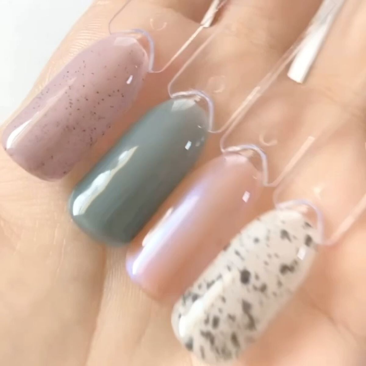 ローズブラウンだけこの中だとすこし透明感が低い色 落ち着いたカラーで使いやすいです 他2つはクリア度が高い色ですベースカラーが透明のままだと 自爪の色が透けてもっとピンクぽさが強く出ます ベース:セリア ピールオフベース トップ:ネイルタウン irogel グロッシートップ (ノンワイプトップ)